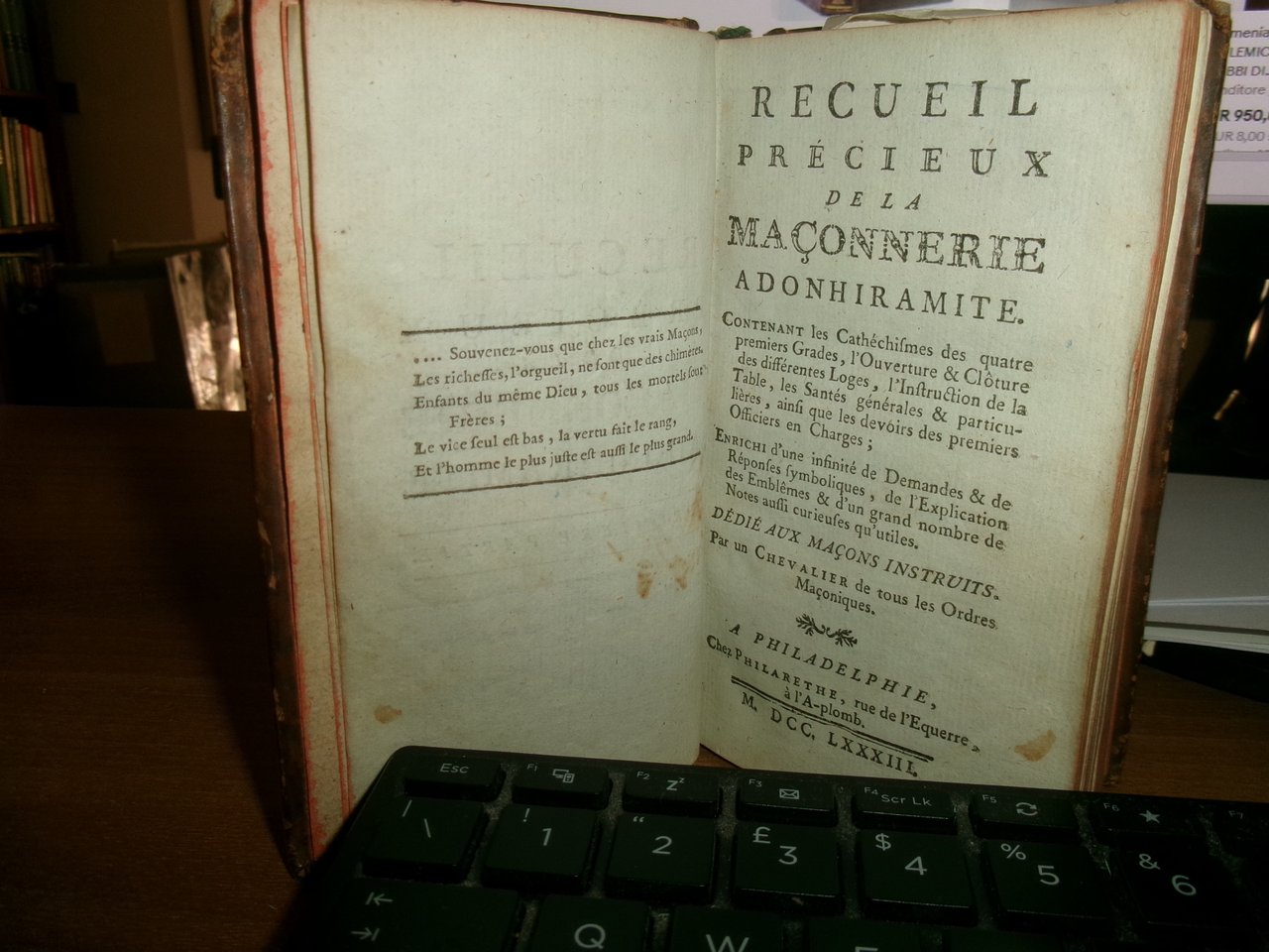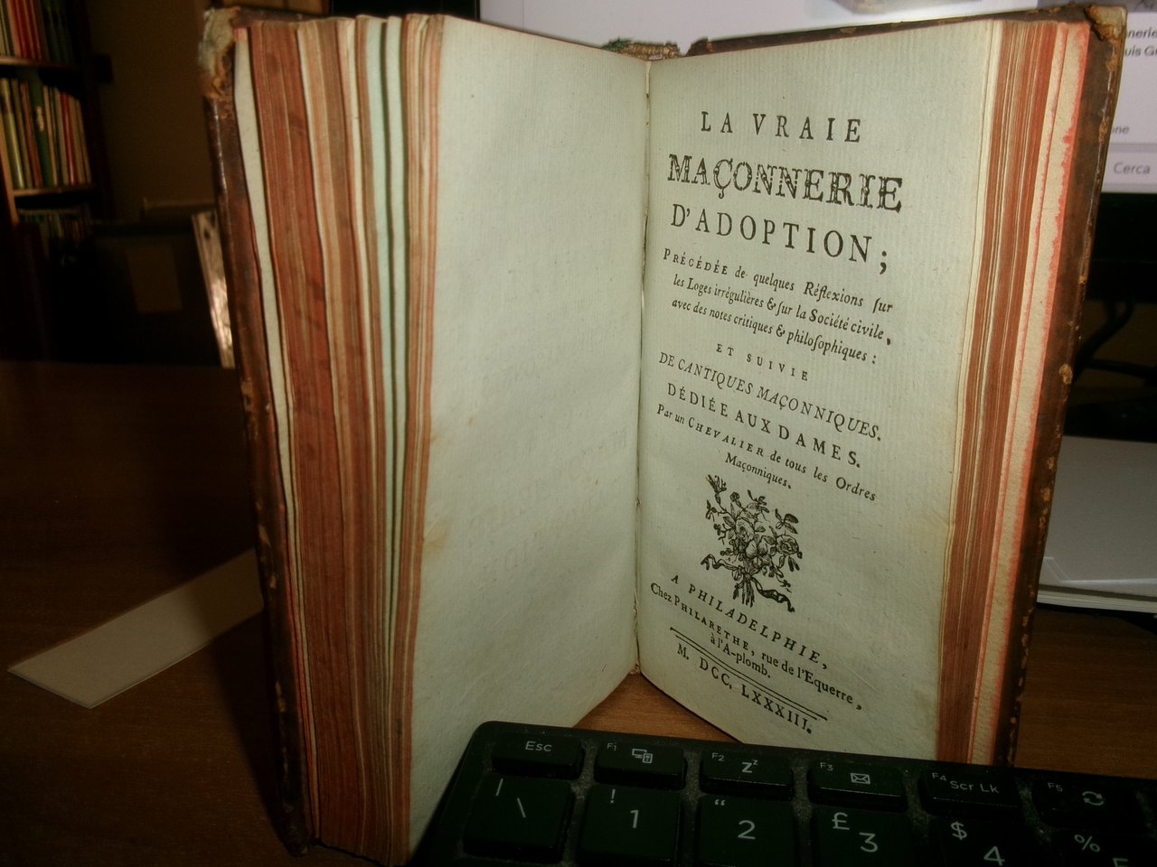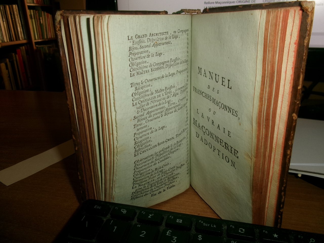 2 volumi legati assieme in-12°, piena pelle coeva. (4), 115 pp., 1 tavola f.t.; (4), 147, (3) pp. Edizione rarissima. Wolfsstieg, 33380. Fesch, 719: << Nous n' avons pas cette éditon... >> (Unito:) La vraie Maçonerie d' adoption... suive de contienes maçonniares. Dedié aux Dames. Philadelphie, Philarèthe, 1783. 142, (2) pp. Wolfstieg, Erganzungsband, 10995. Fesch, 723. Opere molto rare. Neg. mob. mass. mob. 6