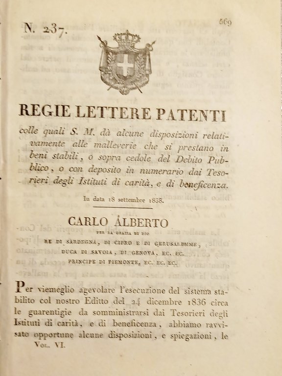 Regie Lette Patenti - Colle quali S. M. dà alcune disposizioni relativamente alle malleverie che si prestano in beni stabili, o sopracedole del debito Pubblico, o con deposito in numeraro dai Tesorieri degli Istituti di carità , e di beneficenza - 1838 Pagine 12 - N. 237 Condizioni molto buone.