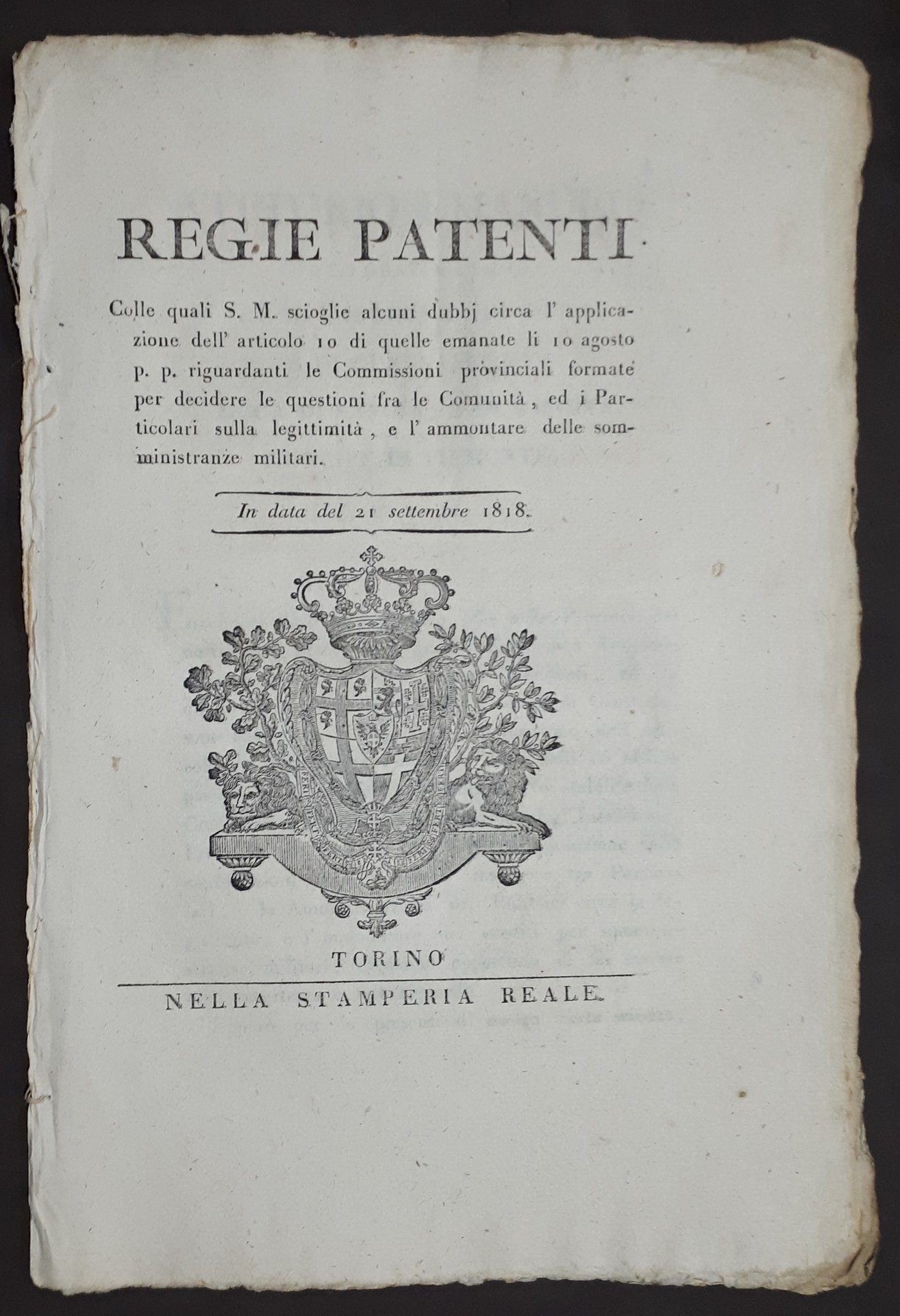 Regie Patenti - Colle quali S. M. scioglie alcuni dubbi circa l'applicazione dell'articolo 10 di Commissioni provinciali formate per decidere le questioni fra le Comunità ed i particolari sulla leggittimità , e l'ammontare delle somministranze militari. In data 21 Settembre 1818 Pagine - 4  Condizioni molto buone