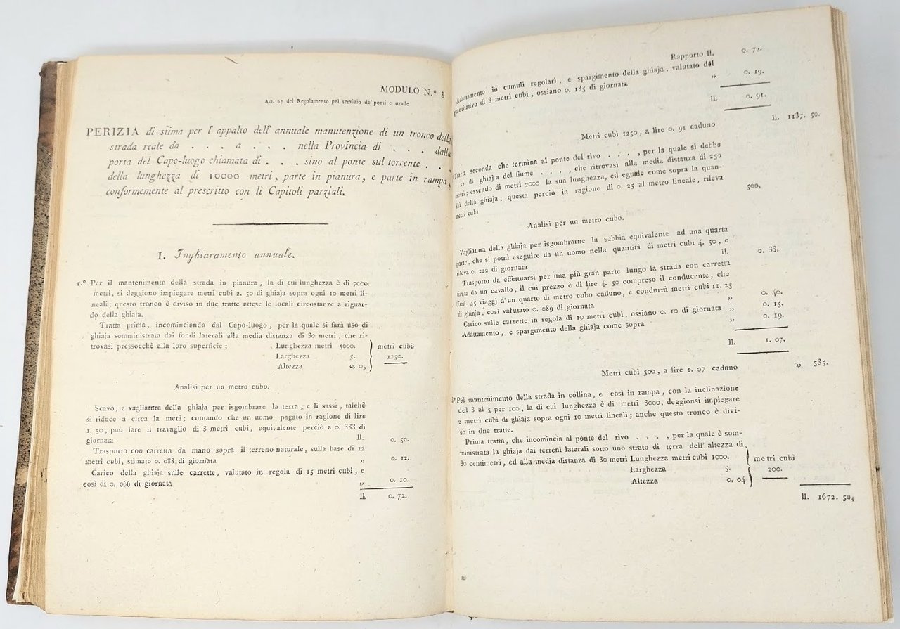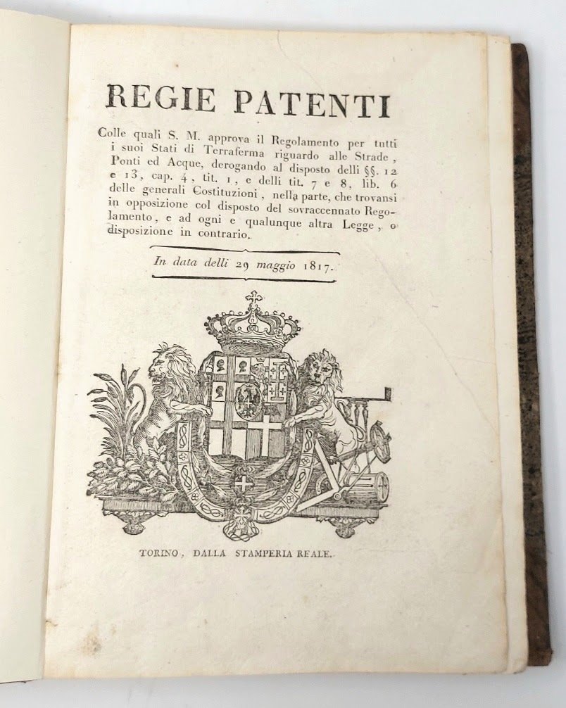 >in-4, pp. (6), 198, (48), leg. coeva mezza pelle e angoli, titolo e filetti oro al dorso. Fondamentale codice emanato da Vittorio Emanuele I che disciplina e regolarizza, a partire dall'anno 1817, la costruzione, i servizi, la custodia e la manutenzione , gli atti e contratti, di tutte le vie di comunicazione terrestri e fluviali, strade Reali e strade Comunali percorribili nello Stato Sabaudo. Ottimo esemplare di raro codice Sabaudo di viabilità regionale. Manno-Promis, Bibliogr. Stati Sardi, I, n. 2850-2890