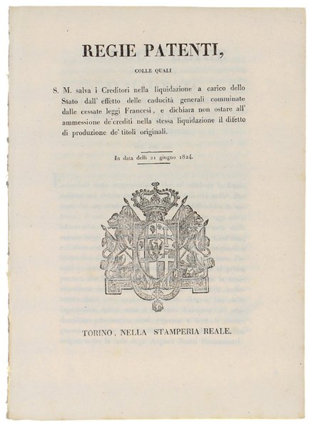 REGIE PATENTI colle quali S.M. salva i Creditori nella liquidazione a carico dello Stato dall'effetto delle caducità generali comminate dalle cessate leggi Francesi…In data delli 21 giugno 1824 [documento originale].