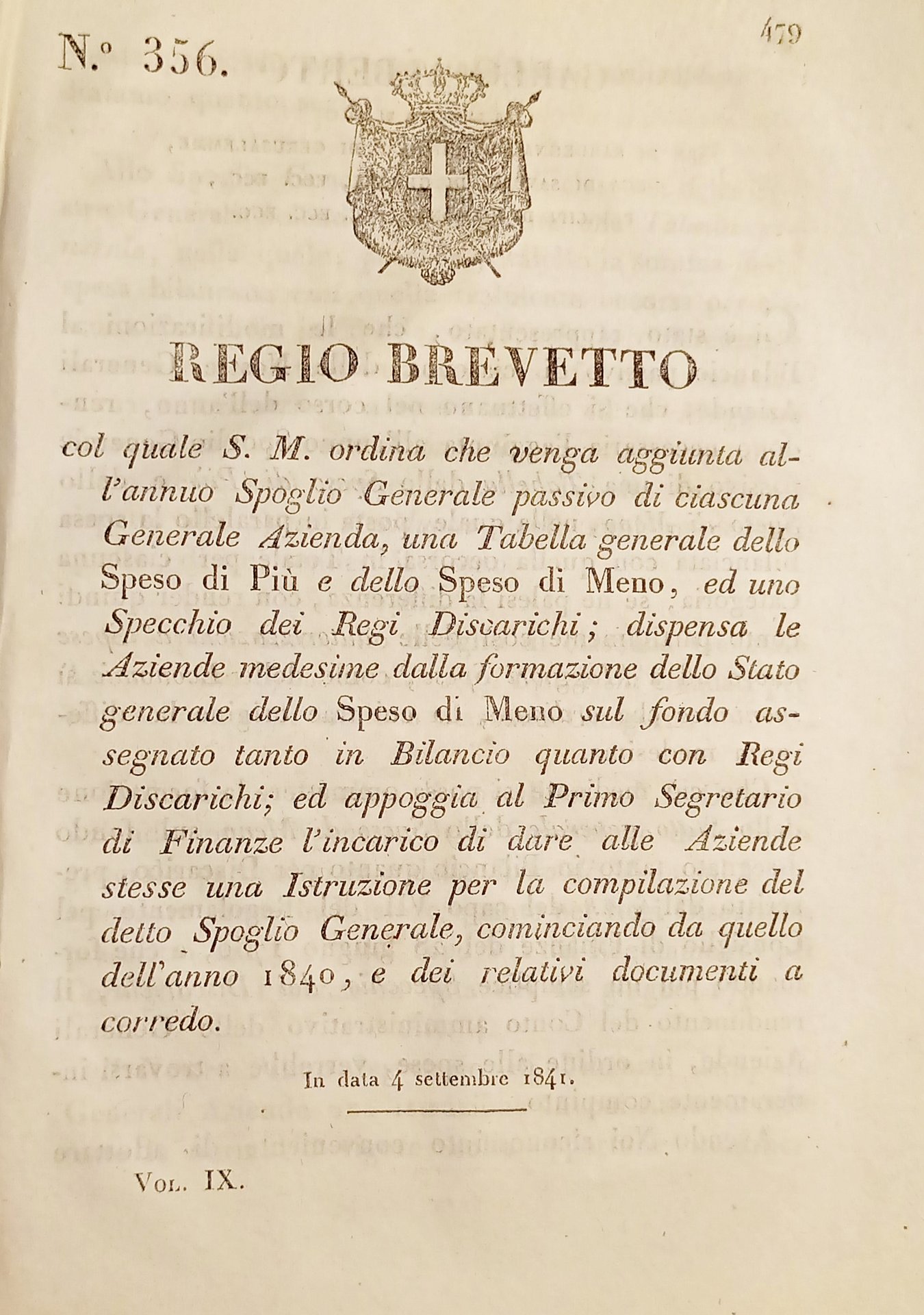 Regio Brevetto col quale S. I. ordina che venga aggiunta all'anno Spoglio Generale passivo di ciascuna Generale Azienda, una Tabella generale dello Speso di Più e dello Meno - 1841 N. 356 Pagine 4 Condizioni molto buone.
