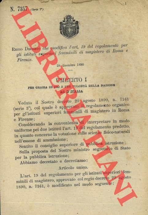 Regio Decreto che modifica l'articolo 19 del regolamento per gli istituti superiori femminili di magistero di Roma e Firenze.