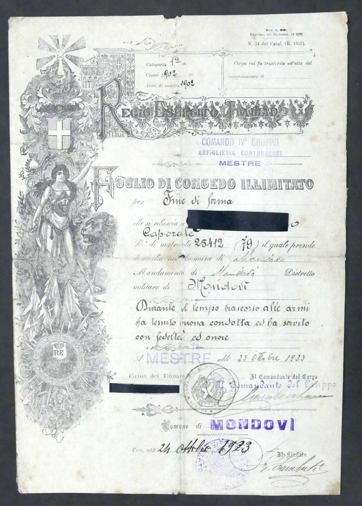 Regio Esercito Italiano - Foglio di Congedo illimitato - Mondovì - 1923