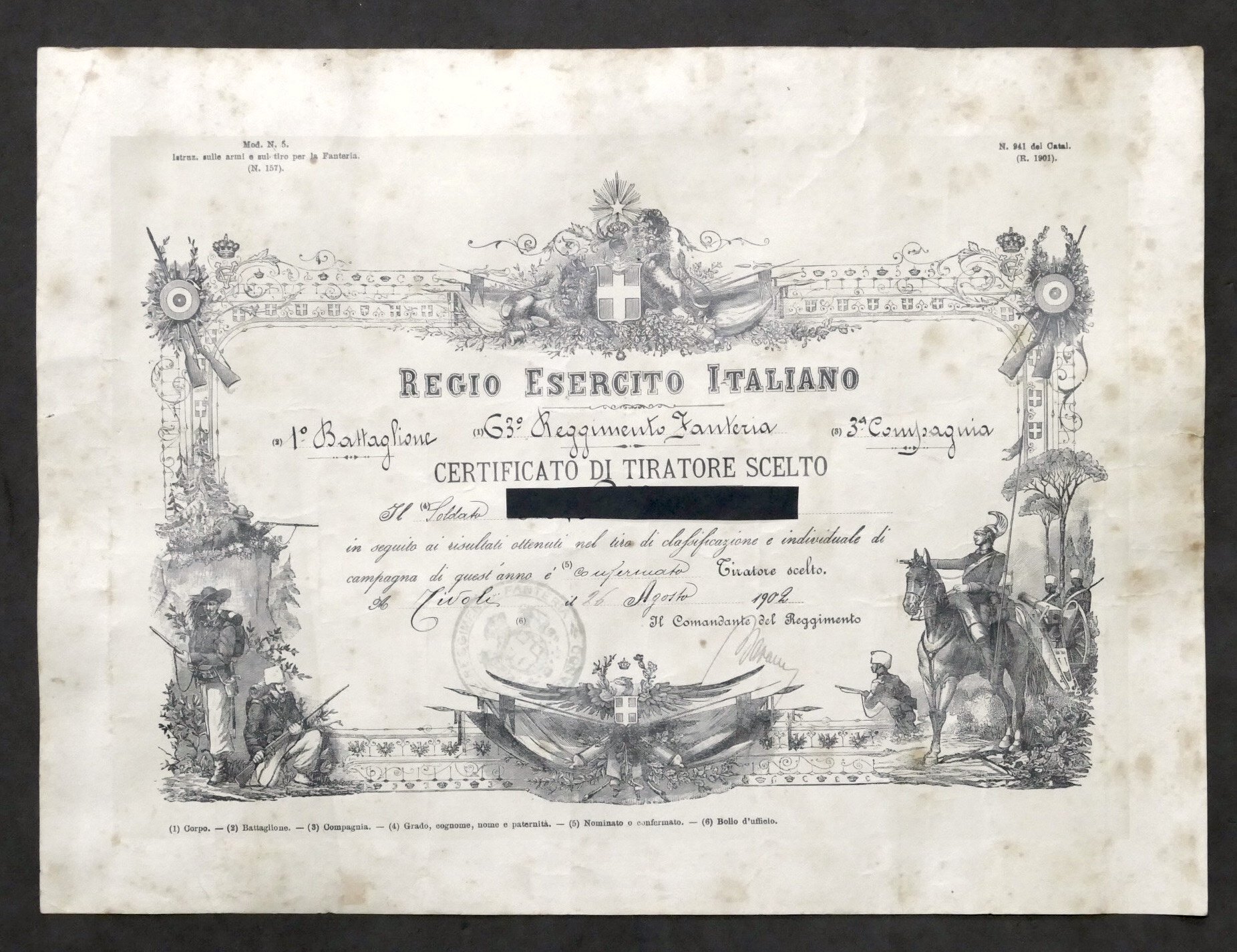 Regio Esercito Italiano - 1° Battaglione, 63° Reggimento Fanteria, 3^ Compagnia - Certificato di Tiratore Scelto - Datato: Tivoli, 26 Agosto 1902 Dimensioni: 22 x 30 cm ca. Lingua italiana. Buone condizioni generali. Qualche piccola macchia, come da foto.
