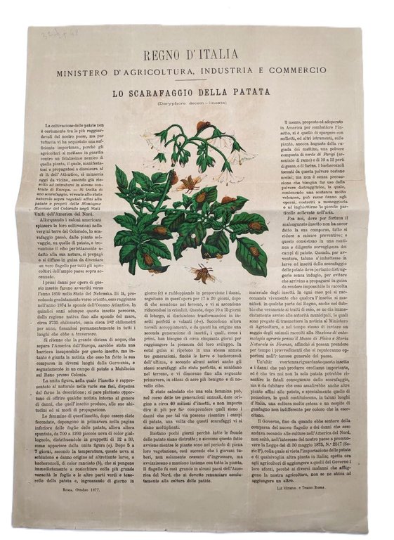 Regno d'Italia ministero dell'Agricoltura industria e commercio lo scarafaggio della patata Roma ottobre 1877