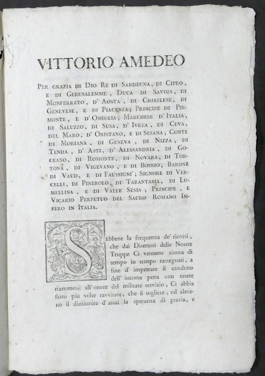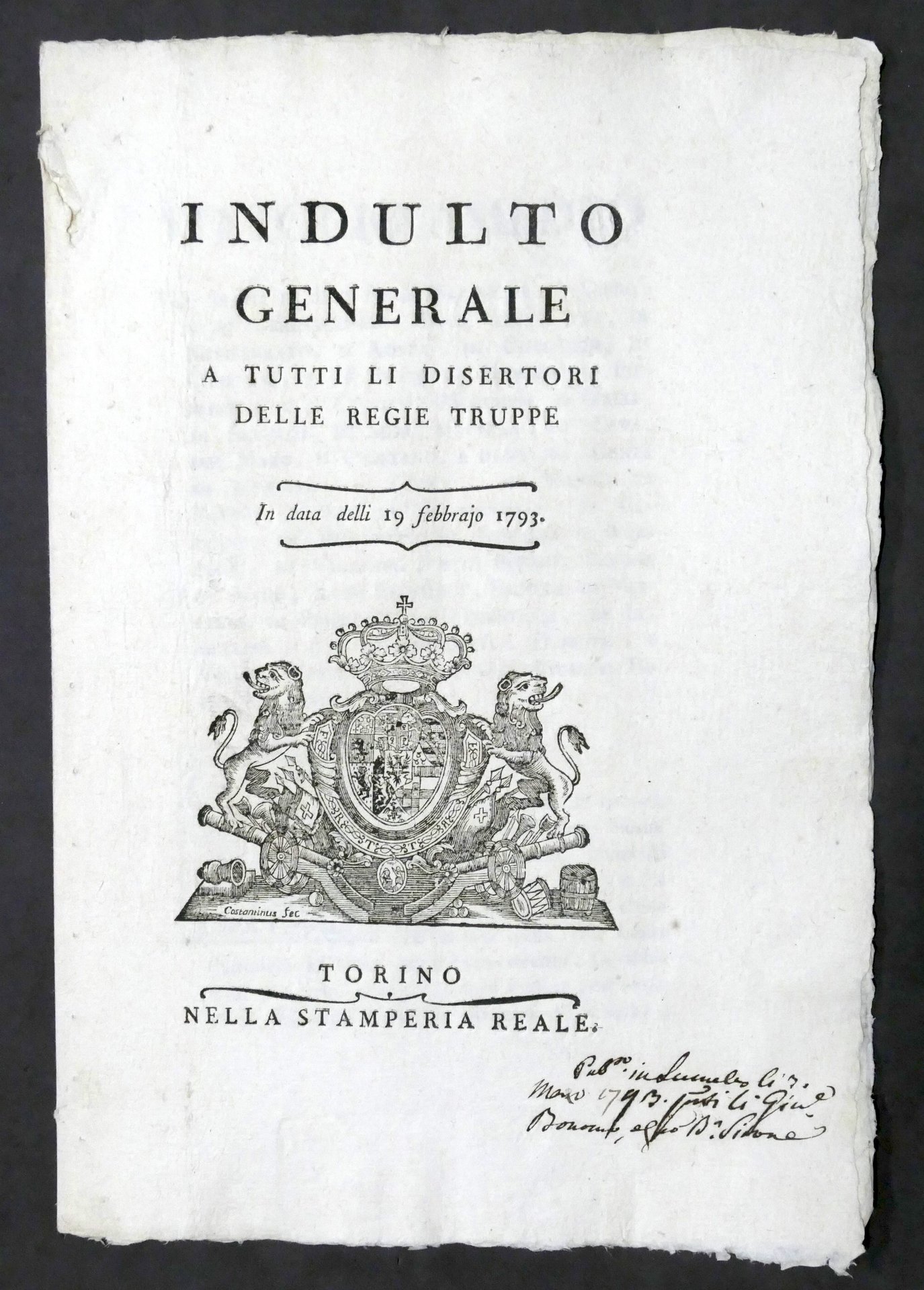 Regno di Sardegna Indulto generale a tutti i disertori delle Regie Truppe - 1793