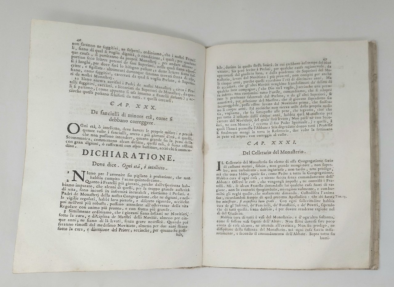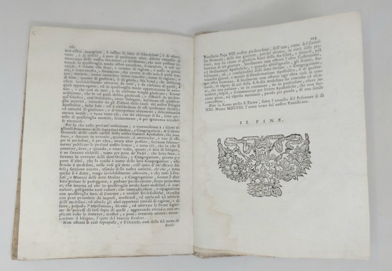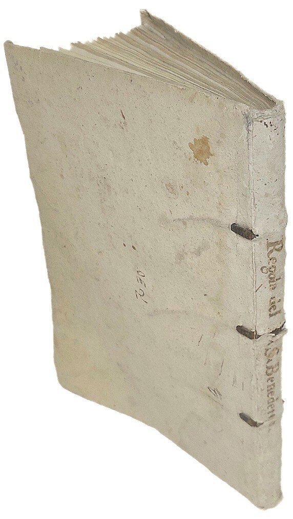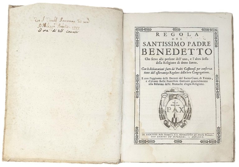 >in-4, pp. (8), 163, (1), leg. coeva cart. rustico originale, titolo ms. al dorso. Al tit. bella bordura silogr. e ovale inc. con arma araldica Albani sormontata da cappello cardinalizio; iniziali, testatine e finalini n.t. Pregevole elegante edizione della Regola monastica di San Benedetto, corredata dalle osservazioni dei Padri Cassinesi, da una serie di decreti tridentini e da Bolle pontificie sulle riforme monastiche femminili. Note di mano settecentesca sulla sguardia anteriore: ''Est Vitalis Ravennae ad usu D. Philippi Bonfondi 1757'', ''E ora di Francesco Cavalli''. Bell'esemplare, fresco (salvo alone d'umido al margine interno dei primi ed ultimi fogli).