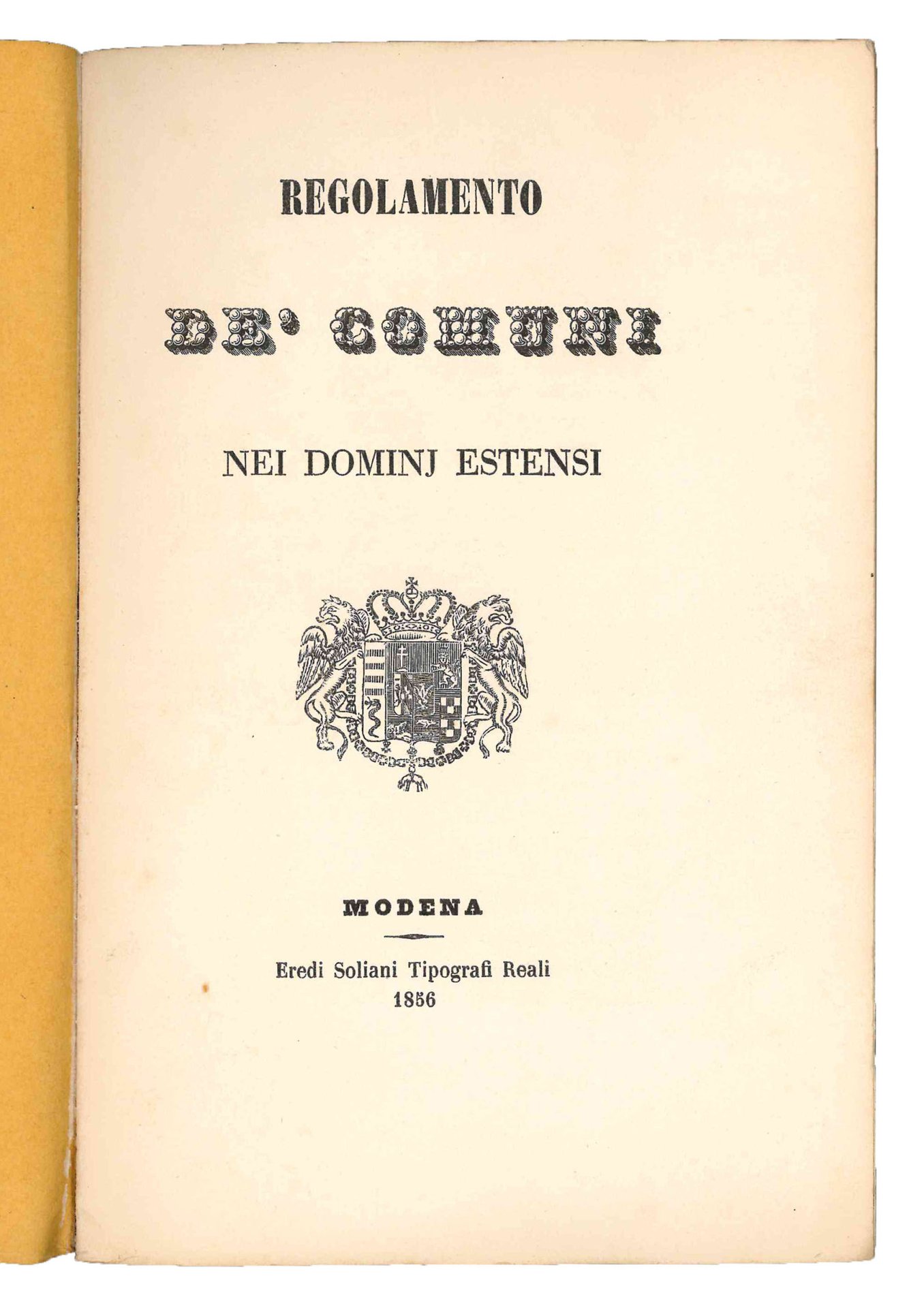 Mm. 228x148. Pp. 51, [1]. Con stemma Estense xilografico al frontespizio. Brossura muta originale. Prima ed unica edizione. Esemplare in ottimo stato di conservazione.L'opuscolo contiene il decreto di Francesco V, duca di Modena, che inizia: "Ridotta uniforme la legislazione civile e criminale del nostro Stato. abbiamo giudicato opportuno di togliere egualmente le discrepanze fra i regolamenti comunali vigenti...".
