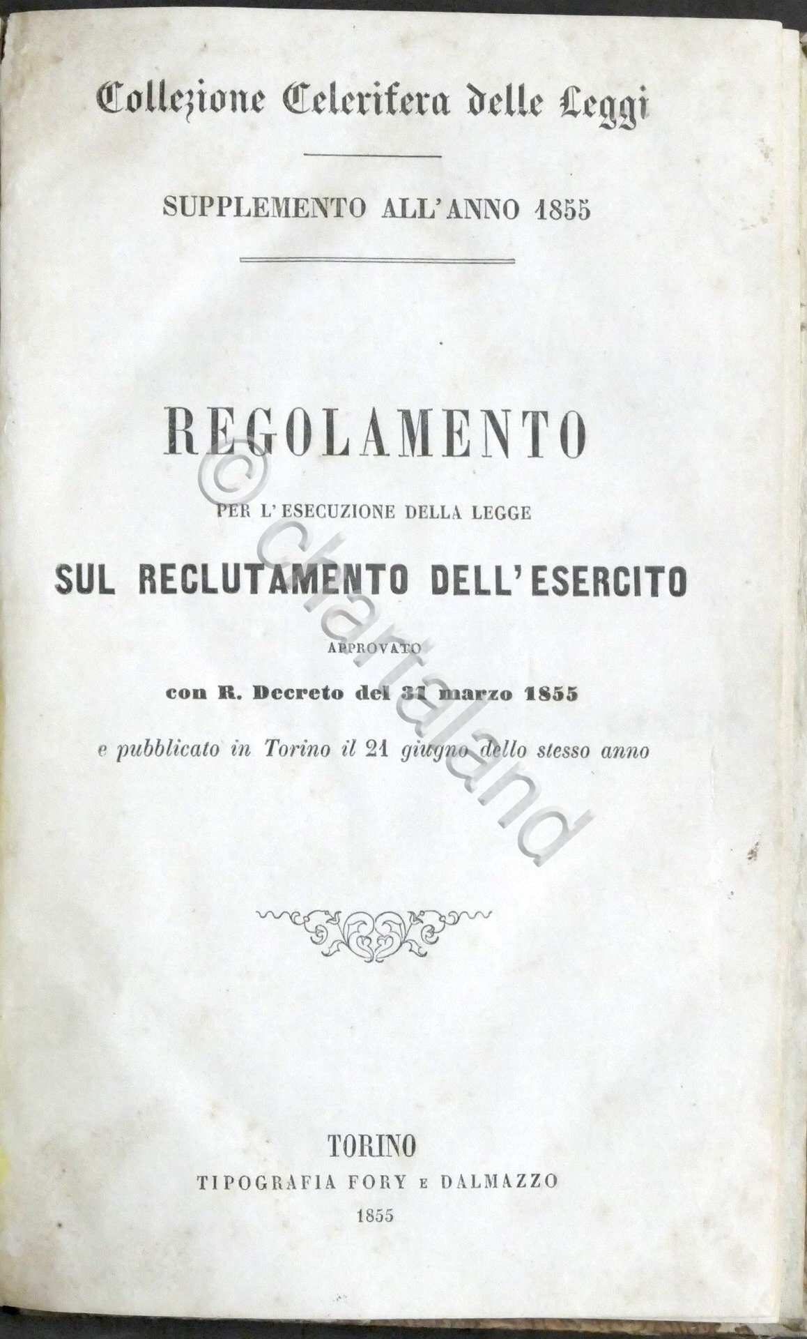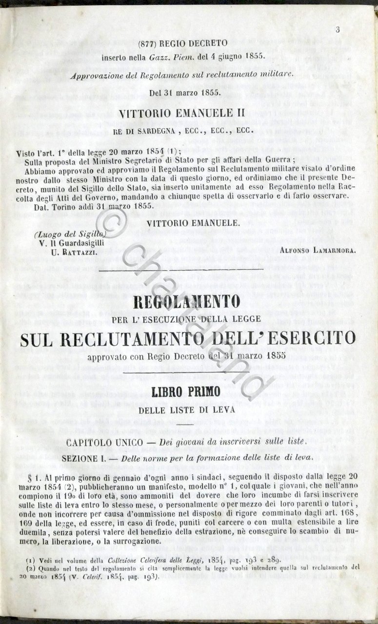 Regolamento per l'esecuzione della legge sul reclutamento dell'esercito approvato con R. Decreto del 31 Marzo 1855
