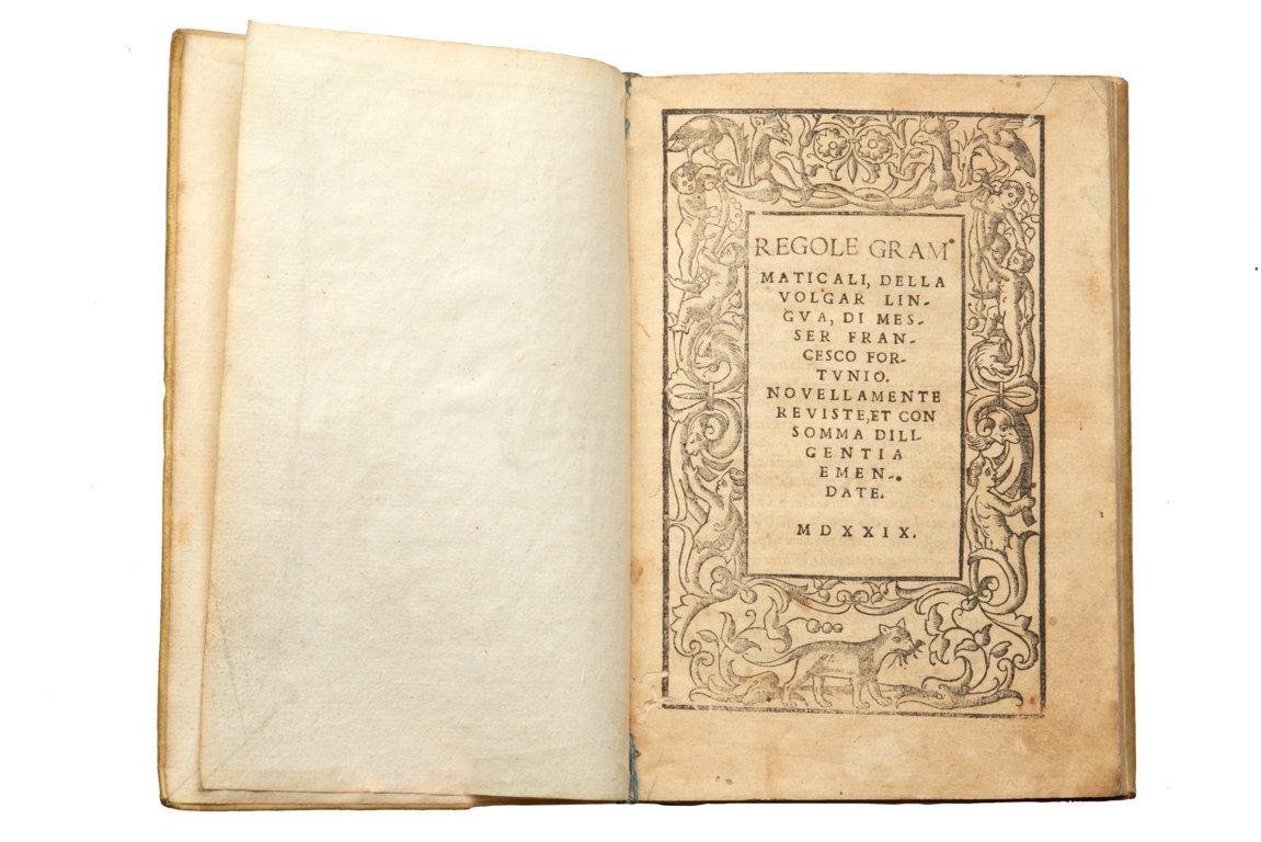 1 volume, carte 56, completo. Legatura antica in piena pergamena rigida. Bel frontespizio in bordura animata. Quest'opera è la prima grammatica italiana. Prima edizione del Sessa e quinta assoluta dopo l'introvabile editio princeps di Ancona.Ristampate per ben venti volte nel corso del ‘500, ma di questi ne vennero pubblicati solo due, quelli relativi alla morfologia e all'ortografia. Le regole costituiscono una grammatica del toscano trecentesco ad uso dei letterati italiani del Cinquecento. Govi, I classici che hanno fatto lItalia, p. 50, per la prima edizione.. *** TUTTI I NOSTRI LIBRI SONO VISIBILI PREVIO CONTATTO MAIL O TELEFONO NELLA NUOVA SEDE DI MILANO: LIBRERIA COSMOPOLIS, VIA JOMMELLI, 22. ***