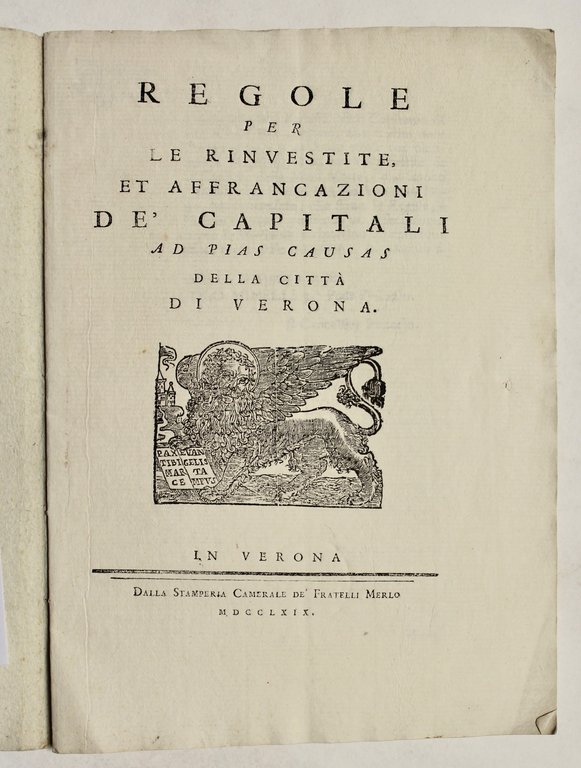 Regole per le rinvestite et affrancazioni de' capitali ad pias causas della città di Verona.