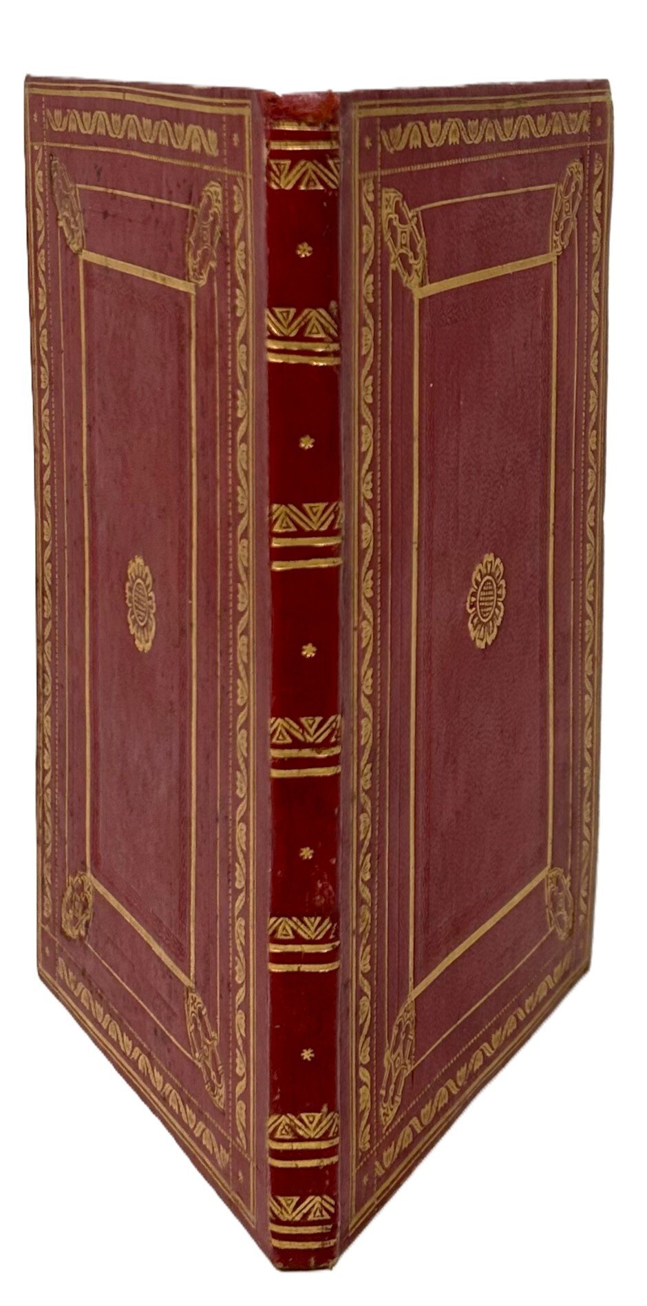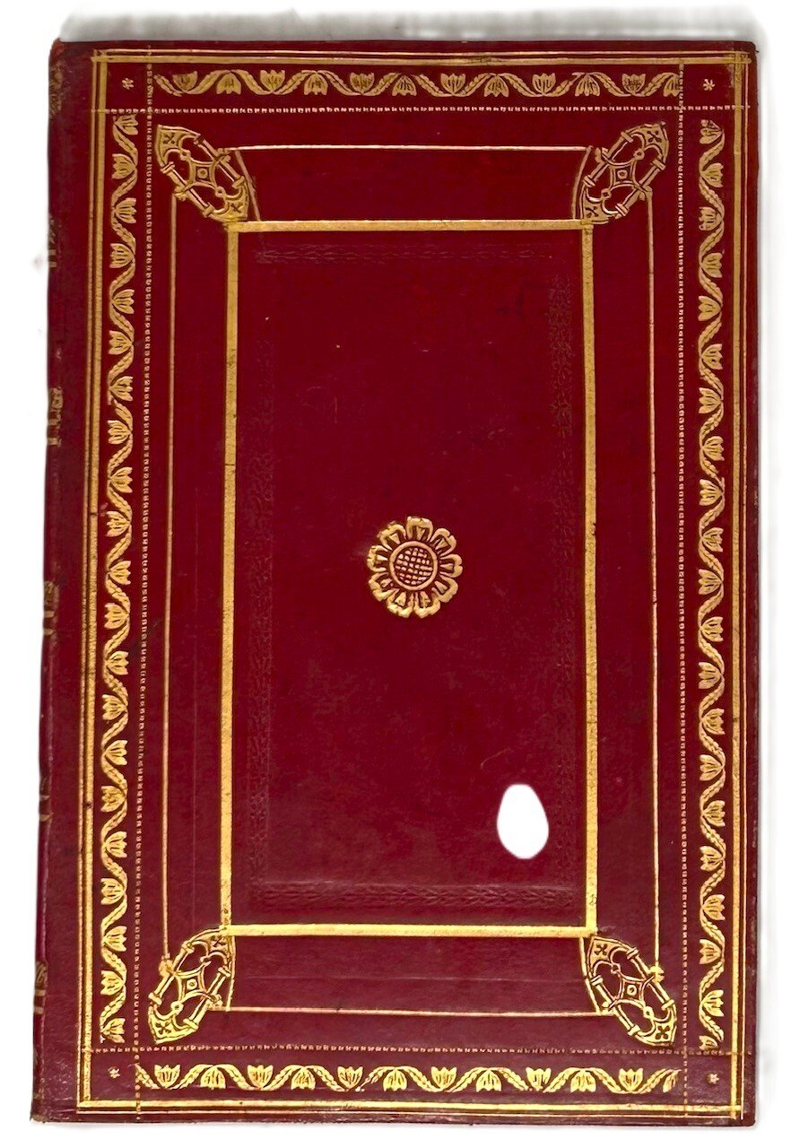 >in-8, pp. 72 (le pp. 21-66 presentano porzione dell'angolo inferiore esterno asportato). Legatura in piena pelle rossa, piatti adorni da cornici concentriche formate da filetti e fregi con fogliette e tlipani, ferri con motivi geometrici accantonati interni, piccolo rosone floreale al centro, dorso a comparti ornato da filetti, cornici geometriche e stelline, il tutto finemente impresso in oro. Contropiatti e sguardie in seta verde, tagli dorati. Contiene le norme per la recita dell'Ufficio Divino e la celebrazione della Santa Messa. Pubblicato per ordine di Giovanni Neuschel, all'epoca vescovo di Parma . Bella legatura ottocentesca di anonimo legatore parmigiano (piccole imperfezioni alla cuffia superiore).
