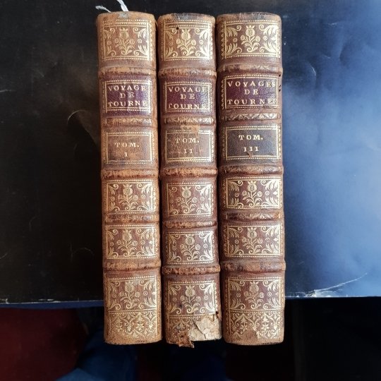 Tre voll. in-8° ( 19 x 13 cm.), pp. (22), 379, 51 tavv. f.t., (4), 448, (4), 40 tavv. f.t., (4), 404, (60), 62 tavv. f.t., legatura coeva in piena pelle bazzana, dorso a cinque nervi con titolo su tessello e fregi in oro, tagli rossi. Leggere abrasioni ai piatti, cuffia inferiore del secondo volume in parte mancante, gora di umidità al margine superiore del primo volume, bruniture maggiormente accentuate al primo volume, le prime carte bianche del secondo e terzo volume sono mancanti, la grande carta rip. delle grotte D'Antiparos presenta uno strappo senza mancanze, nel complesso buon esemplare genuino. Importante viaggio di quella che è considerata la prima spedizione scientifica dell'età moderna voluta da Louis XIV con il fine di ricercare nuove piante, metalli e minerali, conoscere le malattie e i relativi rimedi in uso in quelle terre. Riccamente illustrato da vedute, carte geografiche, piante e animali. Joseph Pitton de Tournefort, insieme ai suoi compagni Andreas Guldelsheimer e il pittore Claude Aubriet, esplora le isole greche del mare Egeo, visita Costantinopoli, per poi raggiungere Trebisonda navigando lungo la costa meridionale del mar Nero, e di qui l'Armenia ottomana, la Georgia e l'Armenia persiana. Ovunque, raccoglie preziose informazioni geografiche, archeologiche, etnografiche, e naturalistiche . Alla fine il bottino ammonterà a oltre 1300 specie, di cui un terzo ignote alla scienza, e 25 nuovi generi. Pritzel, n° 9426 per l'edizione originale