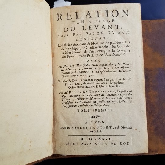 Relation d'un voyage du Levant fait par ordre du roy, contenant l'histoire ancienne et moderne de plusieurs isles de l'Archipel, de Constantinople, des Côtes de la Mer noire, de l'Arménie, de la Géorgie, des frontières de Perse et de l'Asie mineure, avec les plans des villes et des Lieux considerables. enrichie de descriptions de plantes rares, de divers animaux et de plusieurs observations touchant l'histoire naturelle.