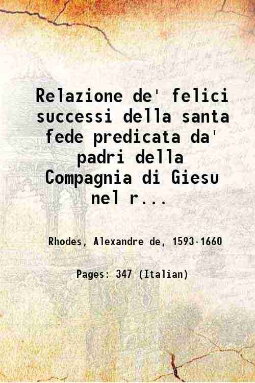 Relazione de' felici successi della santa fede predicata da' padri della Compagnia di Giesu nel regno di Tunchino ./ di Alessandro de Rhodes auignonese della medesima Compagnia, e missionario apostolico della sacra Congregazione de propaganda fide. 1650
