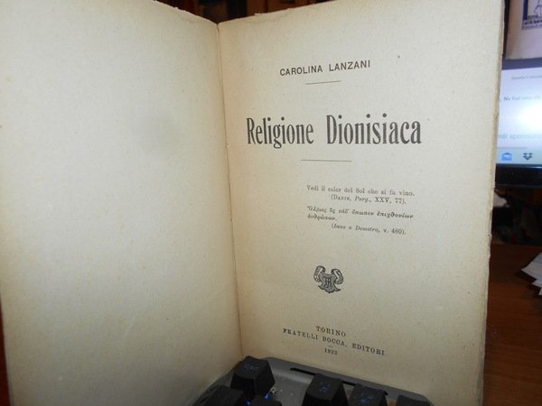 CAROLINA LANZANI. Torino, Fratelli Bocca Editori, 1923. RELIGIONE DIONISIACA. In-16° grande, br. orig. xvi, 251 pp. Lievi segni del tempo nelle brossure, interno ben conservato. Neg. esot. mob. 60 entro busta trasp.