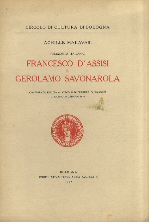 Religiosità italiana: Francesco d'Assisi e Gerolamo Savonarola. Conferenza tenuta al circolo di cultura di bologna il giorno 30 gennaio 1927.