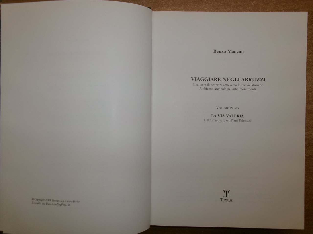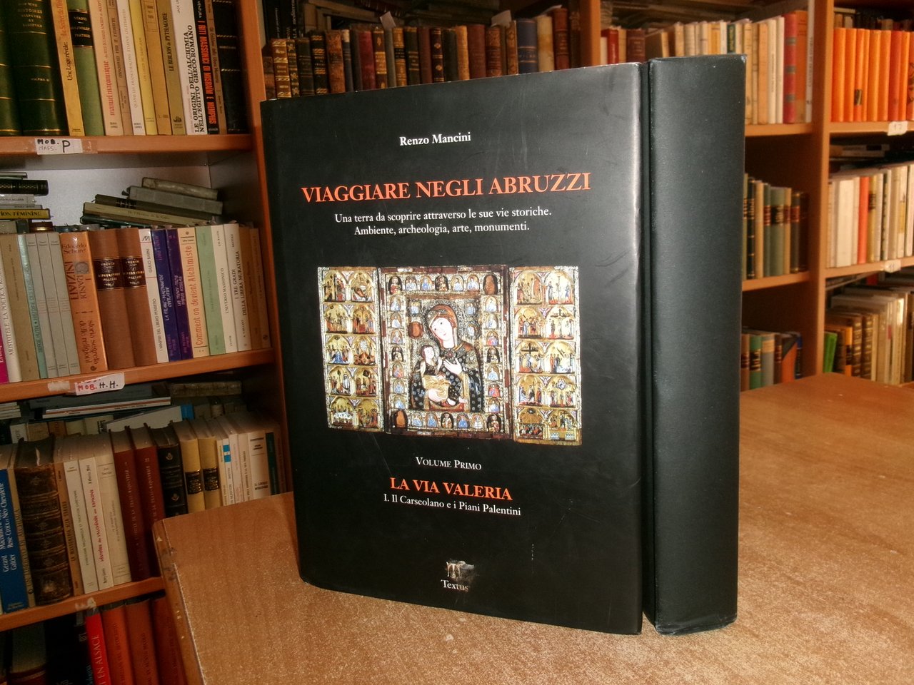 RENZO MANCINI. Viaggiare Negli Abruzzi. Una terra da scoprire attraverso le sue vie storiche. Ambiente, archeologia, arte, monumenti. Solo volume 1 La via Valeria I. Il Carseolano e i Piani Palentini. L' Aquila, Tipografia GTE, 2003. In-8° grande, cartonnato edit. nero con sovracopertina ill. a col. 386 pp. con innumerevoli illustrazioni fotografiche in bianco e nero n.t. Bell' esemplare del solo volume primo. Neg. mob. 25.
