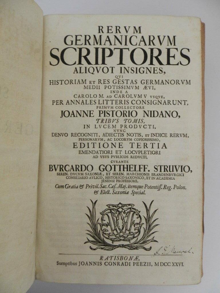 Rerum Germanicarum scriptores aliquot insignes, qui historiam et res gestas Germanorum medii potissimum aevi, inde a Carolo M. ad Carolum V. usque, per annales litteris consignarunt, primum collectore Joanne Pistorio Nidano, tribus tomis, in lucem producti, nunc denuo recogniti, adiectis notis, et indice rerum, personarum, ac locorum copiosissimo. Editione tertia emendiatori et locupletiori ad usus publicus reducti, curante Burcardo Gotthelff. Struvio