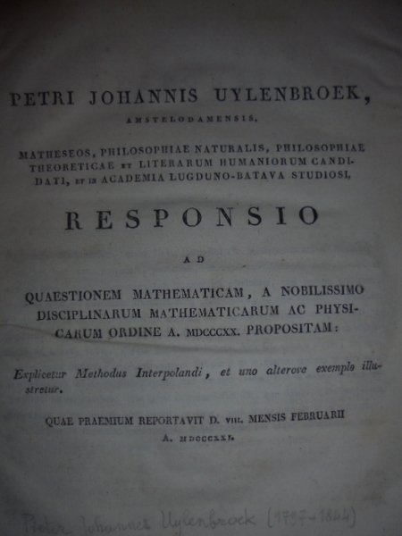 Petri Johannis Uylenbroek (1797 - 1844). Amstelodamensis, 1821. Responsio ad quastionem mathematicam, a nobilissimo disciplinarum mathematicarum ac physicarum ordine A. MDCCCXX. Propositam: Explicetur Methodus Interpolandi, et, uno alterove exmplo illustretur. In - 4° piccolo, cop. muta recente. 77 pp. con una tavola ripiegata in fine. Unknown to Poggendorff. Bierens de Haan, 4909. Neg. sotto esot.