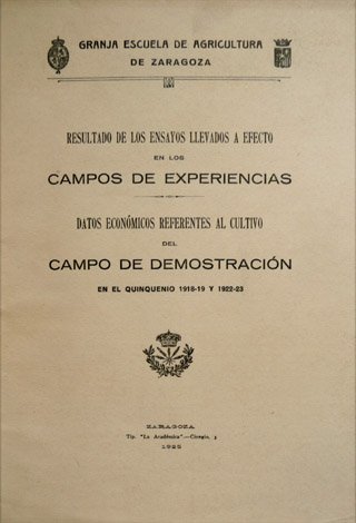 Resultado de los ensayos llevados a efecto en los 'Campos de Experiencias'. Datos económicos referentes al cultivo del 'Campo de Demostración' en el quinquenio 1918-19 y 1922-23. Prólogo de José Cruz Lapazarán.