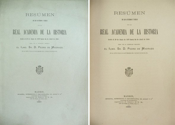 Madrid, Imprenta, Estereotipia y Galvanoplastia de Aribau y Compañía, Sucesores de Rivadeneyra, 1880. Folio; 75 pp. Cubiertas originales.