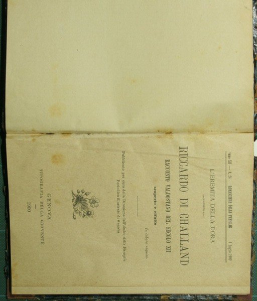 Racconto valdostano del secolo XII - Scoperto e rifatto. Pubblicato per cura della Direzione dell'Amico delle Famiglie Periodico illustrato di Genova - Collana Romanziere delle famiglie. 1 Luglio 1900. Anno XII - N. 26 - in 16° - pp.157 - Mezza pelle con titolo in oro al dorso - Illustrazioni in b/n nel testo - Lievi spellature al dorso