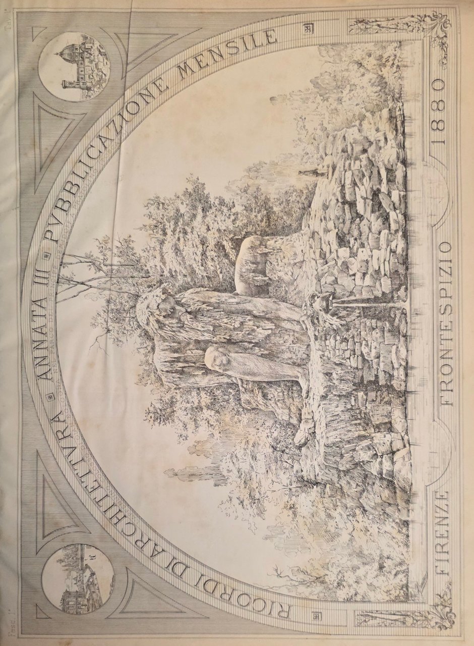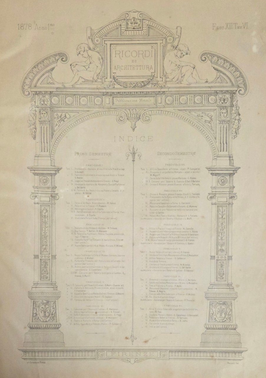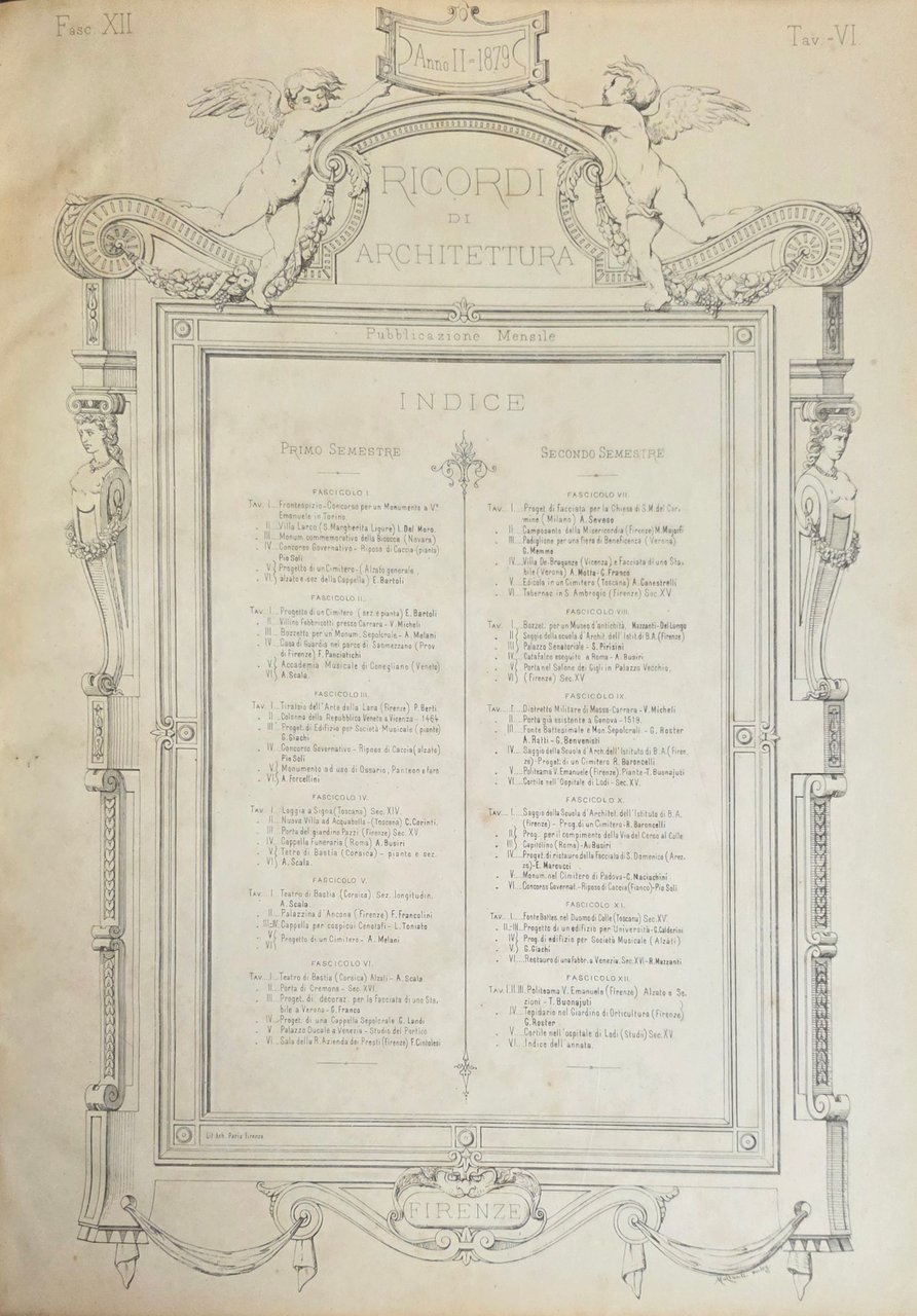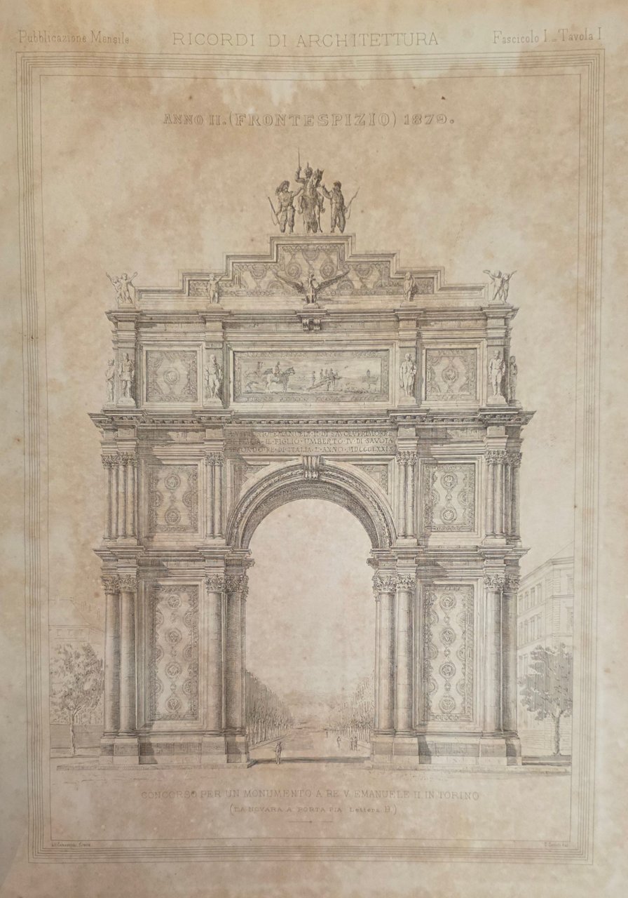 Ogni vol. ha 12 fascicoli contenenti 6 tavv. ciascuno. Nel primo vol. (annata 1878) presenti anche i supplementi del Concorso per l'Ossario tavv. in bianco e nero o color seppia. in folio leg. mezza pelle con piatti marmorizzati, titolo in oro al dorso 5 voll. Buono (Good) Buon es., tracce di umidità alla legatura e fioriture sparse alle pagg..