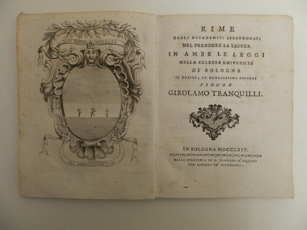 Rime degli Accademici Abbandonati nel prendere la laurea in ambe le leggi nella celebre università di Bologna il nobile, ed ornatissimo giovane signor Girolamo Tranquilli