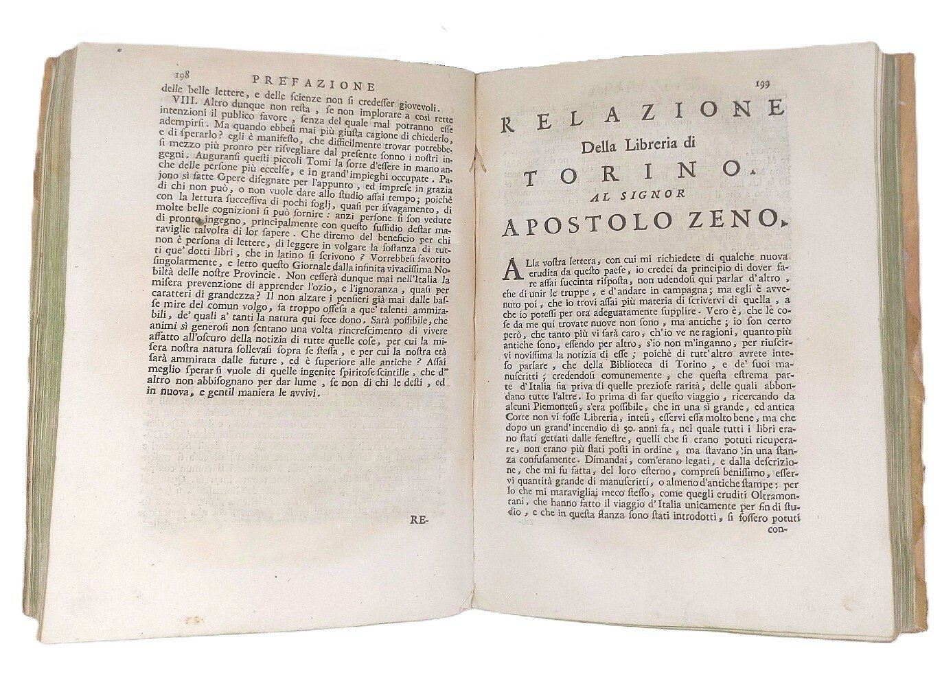 >in-4, pp. (8), 376, legatura coeva in p. pergamena, tassello al dorso con titolo. Con vignetta allegorica al titolo e due tavole incise in rame f.t. (disegno di un ''gravicembalo con piano e forte'' e una pianta della ''Fiera di Verona'' dis. dallo stesso Maffei). Prima edizione di questa raccolta di poesie amorose e musicali, e di prose (di Sc. Maffei, noto letterato di Verona 1675-1755), tra cui spicca la ''Relazione della Libreria di Torino al Sig. Apostolo Zeno'' (pp. 199-214) in cui, insieme ad altre opere ivi da lui vedute, descrive brevemente il ''Theatrum Statuum Sabaudiae'' pubblicato dal Blaeu nel 1682 (che è sicuramente il primo riferimento bibliografico noto della magnifica opera, ancor prima che ne uscissero le ultime due edizioni). Il Maffei riporta notizie relative a manoscritti e libri antichi della Biblioteca di Torino, probabilmente il nucleo originale della Biblioteca Reale, prima che nel 1723, per volontà di Vittorio Amedeo II, venisse accorpata con le Raccolte della Regia Università e del Comune, dando origine alla odierna Biblioteca Nazionale Universitaria (''...poiché di tutt'altro avete inteso parlare, che della Biblioteca di Torino e de' suoi manoscritti... più libri ho qui veduto stampati in carta pecora... ma voi aspettate con impazienza ch'io vi parli de' manoscritti, che sono la vostra passione dominante..''). Le pp. 330-339 contengono un primo embrione del trattato che sarà pubblicato nel 1747 sulla formazione dei fulmini; ad esso fa seguito il ''Ragionamento sopra la regolazione dell'Adige''. Buon esemplare. Gamba, Testi di lingua, n. 2324.