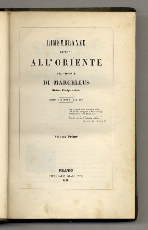 Rimembranze intorno all'Oriente del Visconte di Marcellus, Ministro Plenipotenziario. Prima versione italiana. Volume I (-II). (Il volume 1°, in cui è dato anche sunto del Corano, contiene le "Nozioni preliminari intorno allo stato politico, morale e sociale della Turchia. Capitolo estratto dal Viaggio in Siria ed in Egitto del conte F.C. Volney nella versione italiana di Leonardo Rossi, con note di F.C. Marmocchi").