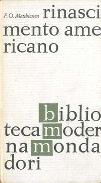 871 p. ; 19 x 11 cm. Biblioteca moderna Mondadori. Sezione Critica saggistica. A cura di Franco Lucentini. Titolo originale dell'opera: "American Renaissance". A prefazione di questo volume è riportato il saggio che Cesare Pavese pubblicò con questo titolo sulla "Rassegna d'Italia" del dicembre 1946, non solo perché Pavese fu forse il primo in Italia a interessarsi attivamente di Matthiessen, ma anche perché patrocinò questa edizione italiana di American Renaissance. Legatura editoriale, coperta in cartone rigido con impresso il titolo al piatto e al dorso. Codice libreria 1338.