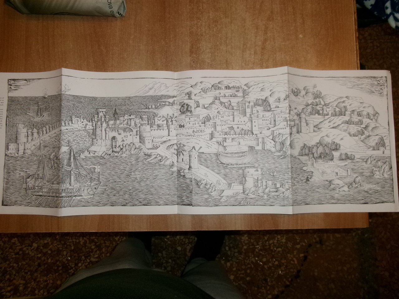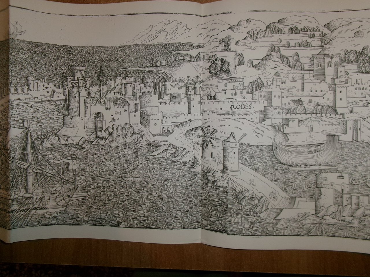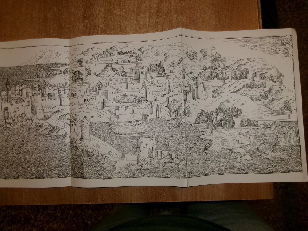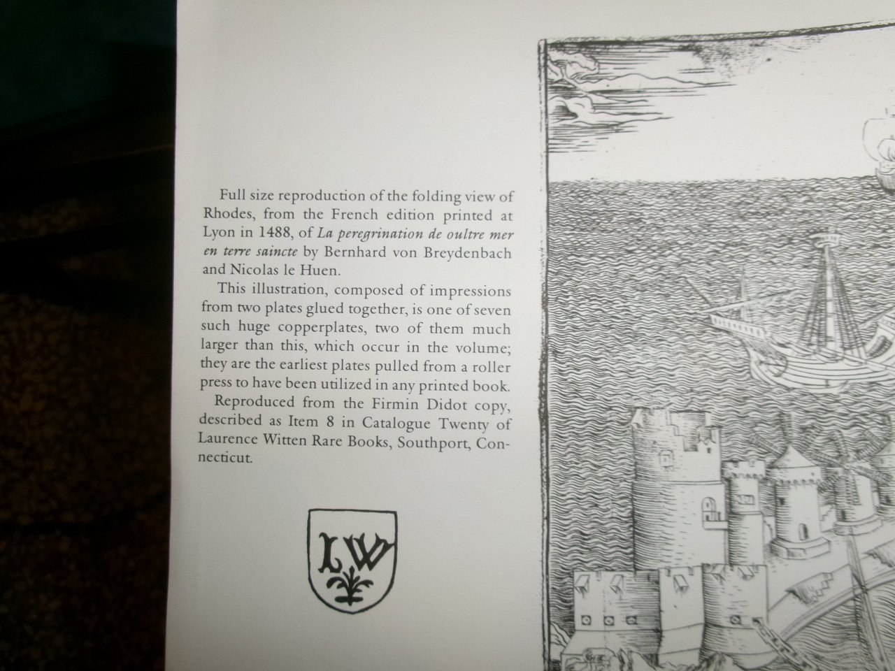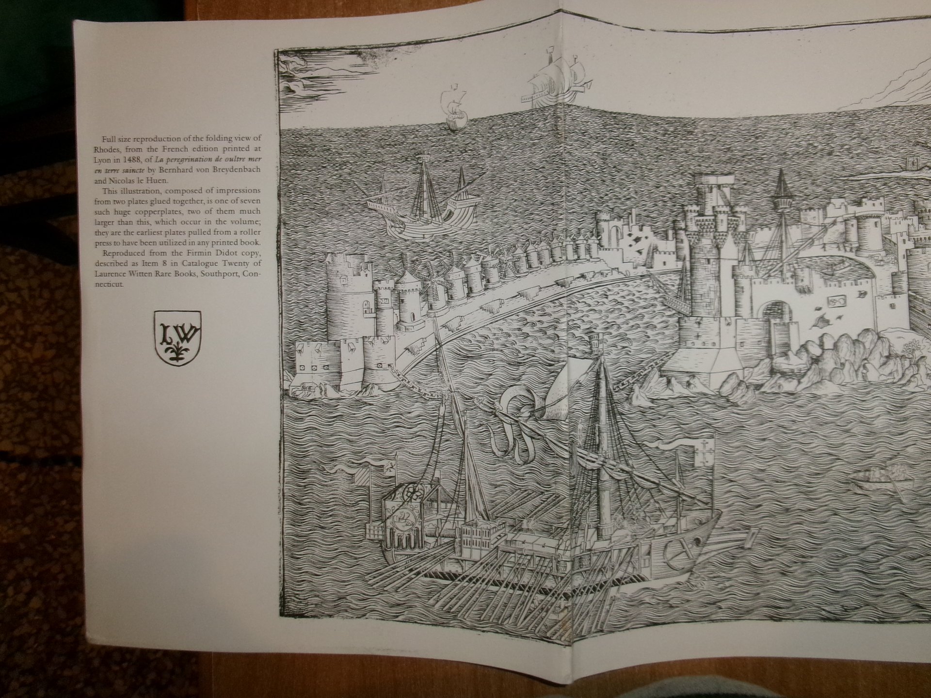 (Riproduzione) By Bernhard von Breydenbach and Nicolas le Huen. 1 foglio in-8° oblungo (87,5 x 28 ) cm. Full size reproduction of the folding view of Rhodes, from the French edition printed at Lyon in 1488 of la La Peregrination de oultre Mer en Terre Saincte. This illustration, composed of impression from two plates glued together, in one of serven such huge copperplates, two of them munch larger than this, which... Ottimo stato. Neg. mob. E entro busta trasp.