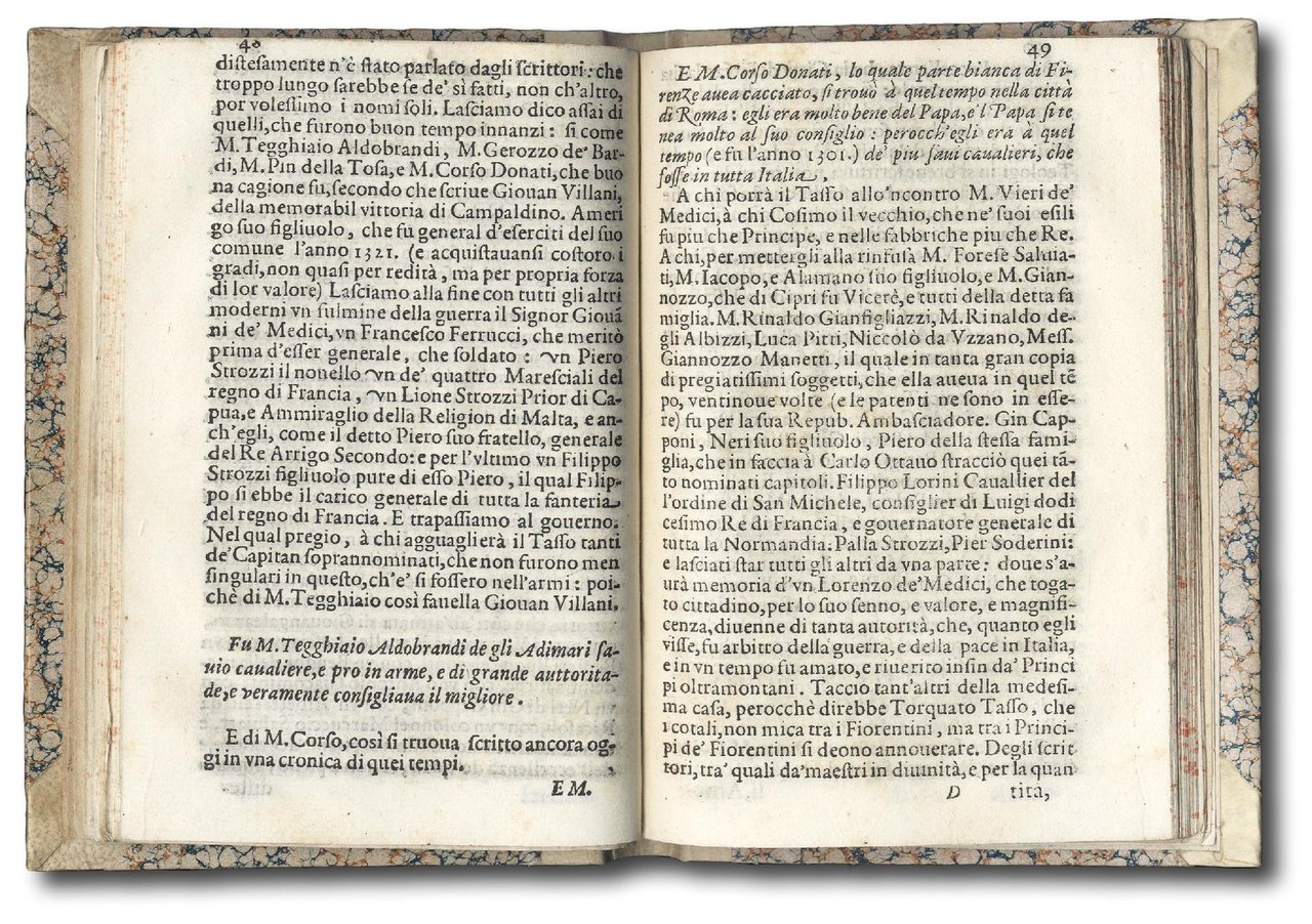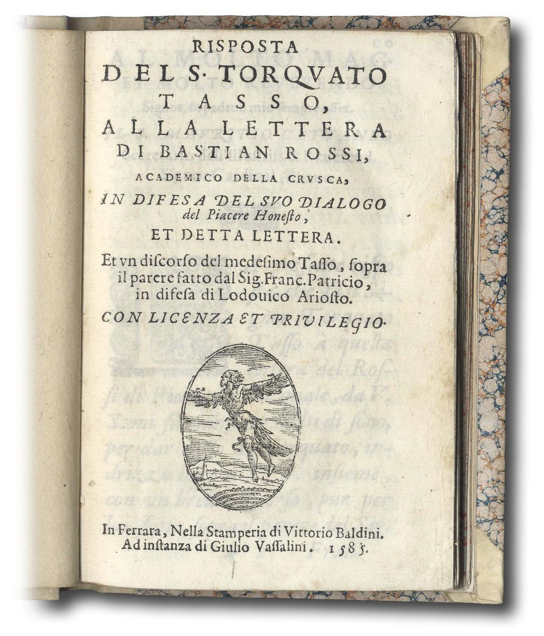 >in-8 (149x107 mm), pp. (16), 117, (3), legatura posteriore in mezza pergamena e angoli. Impresa tipogr. al tit., fregi ed iniz. silogr., testo in car. tondo e corsivo. Prima edizione (contemporanea ad altra di Mantova) di questi scritti minori di polemica letteraria. Alla dedica dell'editore Gio. Batt. Licino a Maurizio Cattaneo seguono: due sonetti di Angelo Grillo in lode del Tasso, la lettera di Bastiano de' Rossi a Flaminio Mannelli ''nella quale si ragiona di Torquato Tasso'', il ''Parere scritto al Principe...sopra il romor di Napoli'' (dal Tasso attribuito al Martelli; v. pag. 5), ''Risposta di Bernardo Tasso, padre di Torquato, al parere da Torquato al Martelli'' (pp. 13-23) ed altre due lettere, l'una di Bernardo Tasso a Vincenzo Martelli e la risposta di quest'ultimo (p. 24 e segg.), gli scritti polemici veri e propri occupano le pp. da 71 a fine, rispettivamente la ''Risposta'' (pp. 71-96) e il ''Discorso'' (97-117). Raccolta Tassiana Bergamo n. 1438. BMC 589 (sotto Rossi B.). Adams T-269.