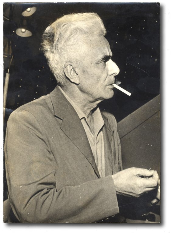 >Fotografia originale (cm 18,1x12,8) in cui lo scrittore è ritratto in età anziana, di profilo nell'atto di accendersi una sigaretta. Al verso della foto timbro dello studio fotografico romano Publifoto e scritta a penna: Secolo 2 col. Lo scatto si colloca nell'ultimo periodo della sua vita, in cui fece ritorno a Roma e lavorò per l'Unità.