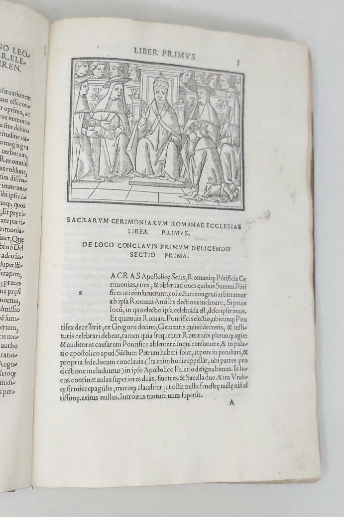 >in-folio (298x199 mm), ff. (6), CXLIII, (1b.), legatura settecentesca piena pergamena rigida, titolo oro al dorso su tassello, tagli cesellati e dorati. (quello superiore annerito). Nei fogli preliminari il privilegio papale e del Senato Veneto, l'indice e la lettera di dedica a Papa Leone X (Giovanni de' Medici) da parte dell'arcivescovo di Corfù Cristoforo Marcello. Testo in nitidissimo carattere romano, spazi con lettera-guida per le iniziali. Con 3 grandi magnifici legni (mm. 95 x 125) all'inizio dei tre libri, raffiguranti il Papa in diverse situazioni cerimoniali. Prima edizione di quest'opera importantissima per la storia della Chiesa, la quale sopperì alla necessità di riunire in un'unica raccolta le prescrizioni da osservarsi nella sacra liturgia. Agostino Patrizi, detto Piccolomini, cerimoniere pontificio, l'aveva compilata fin dal 1488, dedicandola ad Innocenzo VIII, ma ''la compilazione rimase inedita fino al 1516, quando Cristoforo Marcello, fatte alcune mutazioni, la pubblicò e dedicò a Leone X senza presentarsi come autore. Contro il Marcello, il Grassi, allora cerimoniere pontificio, fece un'acre requisitoria...per la divulgazione delle cerimonie pontificie, il che per lui significava esporle al disprezzo. Tuttavia il libro ebbe molte edizioni...'' (Encicl. Catt. III, 1317-8). Bellissimo esemplare su carta forte, a grandi margini (alcune antiche note di possesso e forellini di tarlo sul tit., rare sottolineature e postille di mano coeva qua e là). Sander 5662. Essling 1905. STC It. 383. Adams L-976.