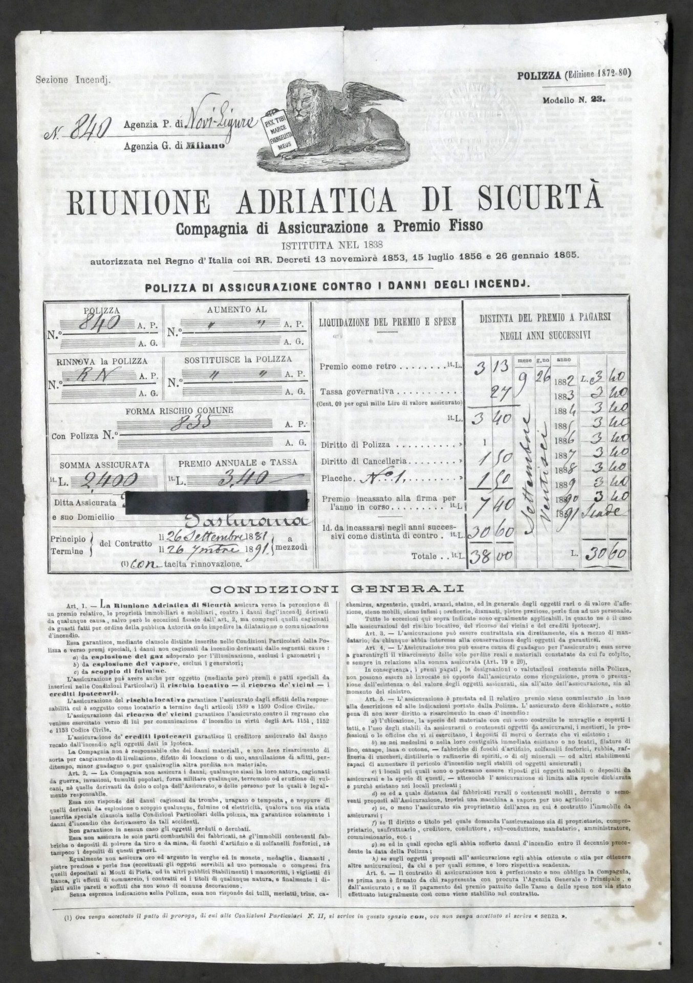 Riunione Adriatica di Sicurtà - Polizza di Assicurazione - Novi Ligure - 1881