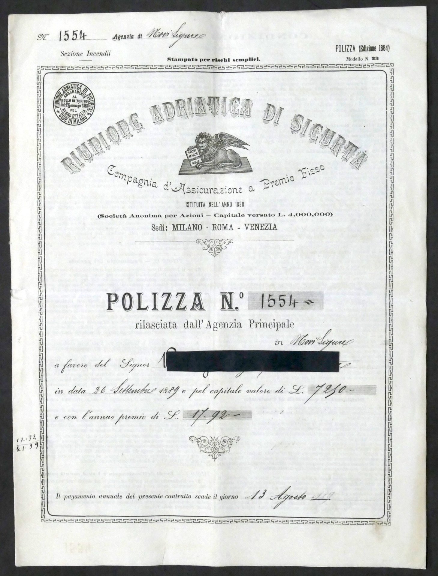 Riunione Adriatica di Sicurtà - Polizza di Assicurazione - Novi Ligure - 1892