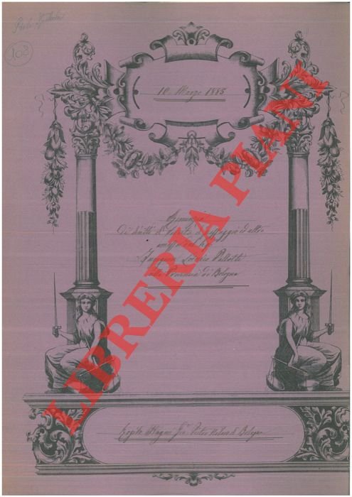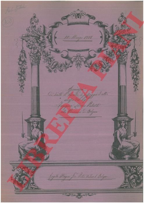 Bologna, 1885, maggio 10, rogito originale di 8 pp. in cartella con bella cornice xilografica, timbro a secco, firma del notaio Pietro Stagni di Bologna