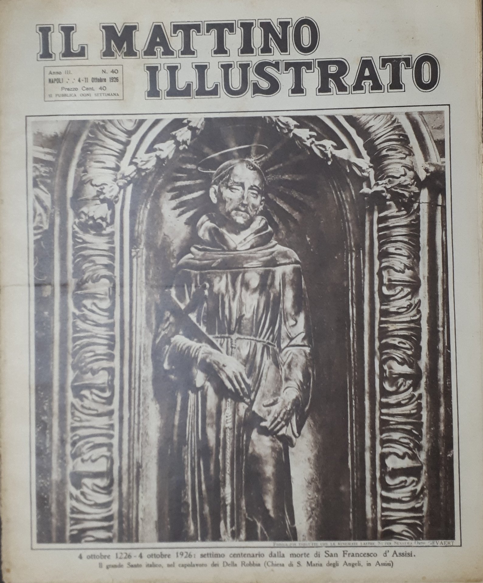 Rivista Attualità - Il Mattino Illustrato N.40 - 4 Ottobre 1226 - 4 Ottobre 1926 - Settimo Centenario dalla di morte S. Francesco d'Assisi - 1926 Testo in lingua italiana, Pag. 12 con illustrazioni Condizioni molto buone come da foto