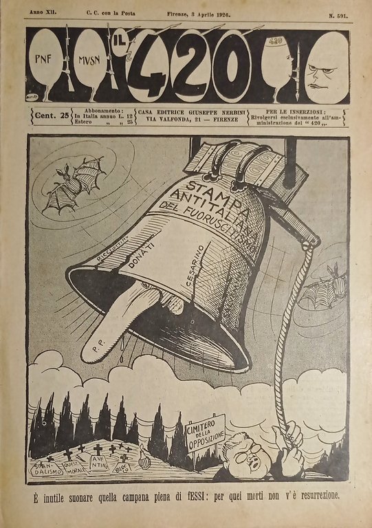 Rivista di Satirica Umoristica - IL 420 - Anno XII - N. 591 - 1926 Testo in lingua italiana. Pagine - 8 con illustrazioni. Copertina morbida. Condizioni molto buone.