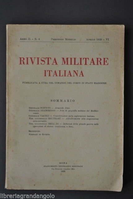 Vedere la descrizione dettagliataRivista Militare Italiana" - Anno II, n. 4, Aprile 1928 - cm. 23,5x17, da pp. 563 a 719+8 grandi tavole ripiegate, Brossura ed. Condizioni di conservazione. Volume con normali segni del tempo. Molto belle le tavole anche a colori, di misure varie ma complessivamente grandi. "Trasporti di truppe sul teatro delle guerra orientale"; "Trasporti ferroviari di radunata dei corpi d'armata"; "Rialtamento ponti e ferrovie.". Per altri volumi e documenti su questo e altri argomenti visitate il nostro negozio "Libreria Grandangolo" CONDIZIONI DI VENDITA Spedizione Fino a 5 kg piego di libri raccomandato, oltre i 5 kg pacco postale. Si ricorda che l'imballo viene eseguito con la massima cura. La merce viene spedita a pagamento avvenuto e viaggia a rischio e pericolo dell'acquirente. Per maggiori informazioni vedi la pagina SPEDIZIONI del nostro negozio. Ritiro diretto Siamo disponibili per il ritiro diretto a Modena e a Milano. Per gli indirizzi delle sedi vedi la pagina DOVE SIAMO del nostro negozio. Acquisti multipli Se si acquistano più libri, la spedizione si paga una sola volta, purché si rispettino gli scaglioni di peso. Estero / Foreign For international shipment, please contact us. Metodo di pagamento Pay Pal, bonifico bancario, versamento postale (cc/p, vaglia o altro). La spedizione avverrà entro i primi 4 giorni lavorativi dopo la conferma di avvenuto pagamento. Si emette ricevuta fiscale e a richiesta fattura. Il pagamento deve essere effettuato entro 7 giorni lavorativi dalla data di acquisto, trascorsi i quali l'oggetto sarà rimesso in vendita. Feedback Viene rilasciato dall'acquirente dopo il ricevimento di quanto acquistato. Data la sua importanza, vi invitiamo a leggere il breve testo della pagina FEEDBACK del nostro negozio. Pertanto, in caso di qualsiasi problema, non esitate a contattarci. Diritto di recesso L'acquirente ha il diritto di restituire l'oggetto entro 14 giorni ed essere rimborsato, escluse le spese di porto e imballo. L'oggetto deve essere restituito, dopo previa comunicazione, imballato e nelle medesime condizioni di come era all'origine. Creato da Turbo Lister Strumento gratuito per mettere in vendita i tuoi oggetti. Metti in vendita i tuoi oggetti in modo facile e veloce e gestisci le inserzioni in corso. "
