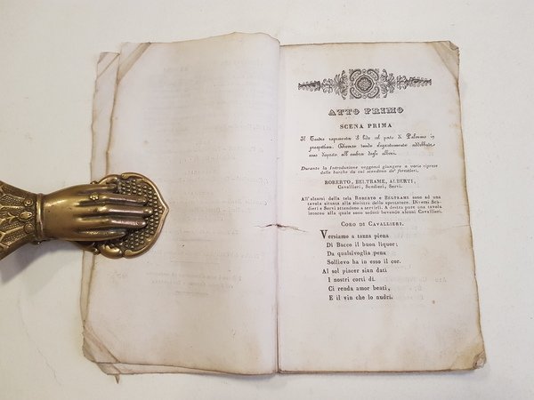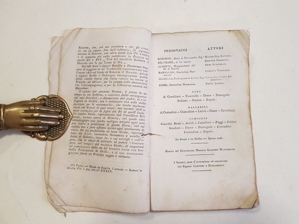 Musica di Giacomo Mayerbeer.<BR>Cm. 18 x 11; pp. 61 con testatine e finalini; bross. edit. quasi sciolta. <BR>CONDIZIONI APPENA ACCETTABILI: piatto anteriore danneggiato, perso quello posteriore; nel retro dell'ultima pag. segni a penna e matita; due note d'epoca a penna sul piatto anteriore (tra cui "andata in scena il 26 dicembre 1844); angoli piegati.<BR>Con i nomi degli interpreti (Giovanni Battista Milesi, Prospero Derivis, Stanislao Demi, Vincenzo Gobetti, Benedetta Colleoni-Curti, Luigia Ponti)
