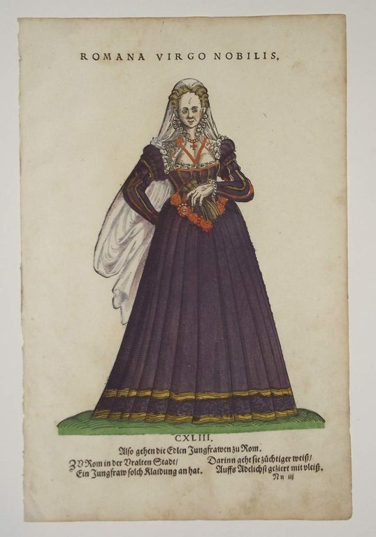 >Silografia originale, foglio di mm 200x310, costumi di nobili e popolani delle varie città d'Italia. Gli elaborati abbigliamenti sono assai fedeli alla moda del tempo e costituiscono una straordinaria documentazione. Eccezionale esemplare, freschissimo e con splendida colorazione strettamente coeva; rarissimo in queste condizioni. La spessa colorazione, esalta soprattutto gli arancioni e i viola. Colas, Bibliogr. du Costume, n. 113. Lipperheide n. 7.