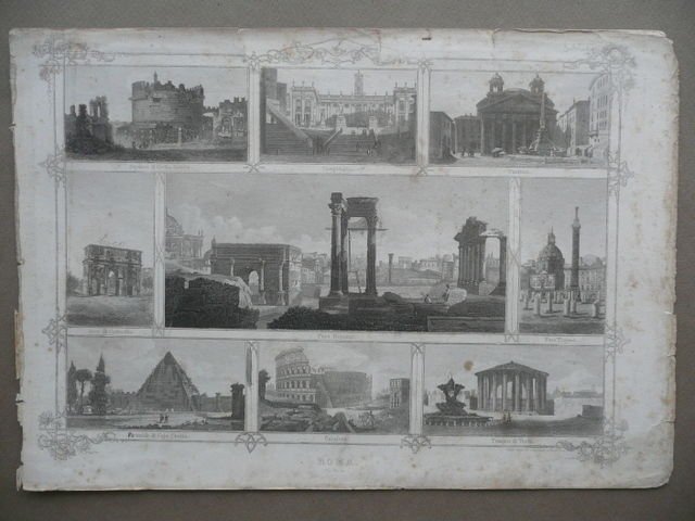 Vedere la descrizione dettagliata Serie di vedute multiple, Roma Le Rovine Vedute Multiple Stabilimento Art. del Lloyd Austriaco, Trieste, s.d. (metà '800), serie di vedute incise in b/n su carta, tutte relative ad antichità presenti a Roma, cm 23x33. Condizioni di conservazione. Esemplare complessivamente in buone condizioni con tracce d'uso e del tempo, alcune leggere bruniture e aloni, margini (due dei quali lievemente rifilati) con alcuni difetti e strappetti, due angoli con piccole mancanze, un margine con tracce di precedente inserimento entro volume. SC03.D8639 N Per libri e documenti su questo e altri argomenti visitate il nostro negozio Libreria Grandangolo" Data l'importanza delle 5 stelle rilasciate durante l'assegnazione del feedback, invitiamo tutti gli acquirenti, se soddisfatti del loro acquisto, a rilasciare tutte le 5 stelle. La mancanza anche solo di una stella illuminata è molto lesiva per noi venditori professionali. Grazie! CONDIZIONI DI VENDITA Spedizione Fino a 5 kg piego di libri raccomandato, oltre i 5 kg pacco postale. Si ricorda che l'imballo viene eseguito con la massima cura. La merce viene spedita a pagamento avvenuto e viaggia a rischio e pericolo dell'acquirente. Per maggiori informazioni vedi la pagina SPEDIZIONI del nostro negozio. Ritiro diretto Siamo disponibili per il ritiro diretto a Modena e a Milano. Per gli indirizzi delle sedi vedi la pagina DOVE SIAMO del nostro negozio. Acquisti multipli Se si acquistano più libri, la spedizione si paga una sola volta, purché si rispettino gli scaglioni di peso. Estero / Foreign For international shipment, please contact us. Metodo di pagamento Pay Pal, bonifico bancario, versamento postale (cc/p, vaglia o altro). La spedizione avverrà entro i primi 4 giorni lavorativi dopo la conferma di avvenuto pagamento. Si emette ricevuta fiscale e a richiesta fattura. Il pagamento deve essere effettuato entro 7 giorni lavorativi dalla data di acquisto, trascorsi i quali l'oggetto sarà rimesso in vendita. Feedback Viene rilasciato dall'acquirente dopo il ricevimento di quanto acquistato. Data la sua importanza, vi invitiamo a leggere il breve testo della pagina FEEDBACK del nostro negozio. Pertanto, in caso di qualsiasi problema, non esitate a contattarci. Diritto di recesso L'acquirente ha il diritto di restituire l'oggetto entro 14 giorni ed essere rimborsato, escluse le spese di porto e imballo. L'oggetto deve essere restituito, dopo previa comunicazione, imballato e nelle medesime condizioni di come era all'origine. "