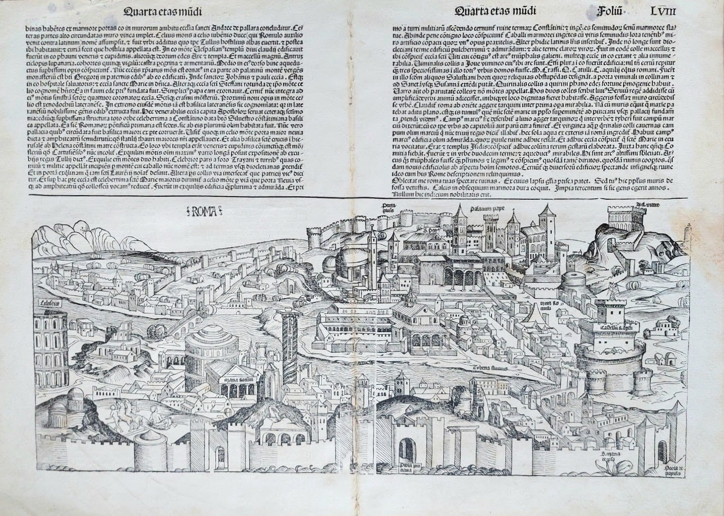 >Xilografia originale su bifolio(mm 595x 430), al recto la grande veduta di Roma [Folium LVIII] ed al verso la veduta di Genua [Folium LVII] su una sola facciata. La grande veduta prospettica è tratta dalla prima edizione del "Liber Chronicarum cum figuris et imaginibus ab Inicio Mundi". Esemplare ben conservato ma con tracce di antica piega centrale, antico rinforzo al verso (3 cm ca.), qualche piccola macchietta grigia.