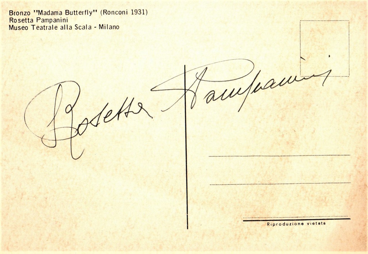 Al recto il bronzo, realizzato da Pietro Ronconi nel 1931 e conservato al Museo Teatrale alla Scala, che riproduce la Pampanini in "Madama Butterfly", al verso autografo del soprano, in ottimo stato.