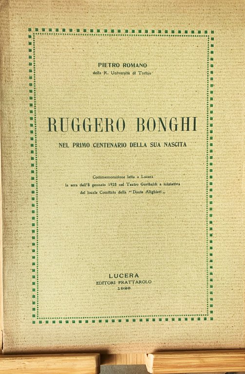 I ed.. Commemorazione letta a Lucera (FG) la sera dell'8 gennaio 1928 nel Teatro Garibaldi a iniziativa del locale Comitato della "Dante Alighieri". VIII, (2)+70, brossura in carta ruvida verde oliva chiaro con titoli in verde entro cornice sempre verde. Con piccolo ritratto in b/n del Bonghi in frontespizio e e con la trascrizione dell'epigrafe, dettata da F. d'Ovidio, incisa nel monumento a R. Bonghi, in Lucera, opera dello scultore d'Orsi (Lucera, 22 ottobre 1899). A p. (1), pagina non stampata, dedica firmata dall'A. ad inchiostro seppia. Stato buono (leggera usura della copertina ai margini - margini e dorso leggermente bruniti - carta delle pagine ingiallita). Indice: Dedica alla Città di Lucera(Giugno, 1928 (VI)) - Parole di presentazione dell'Avv. Mario Prignano, segretario della Sezione lucerina della "Dante" - Discorso commemorativo letto dal Prof. Pietro Romano della R. Università di Torino (Lucera e R. Bonghi - Lo studioso e l'agitatore politico - Il deputato Bonghi - La sua azione e concezione politica - Lo scrittore e pensatore - L'educatore della coscienza nazionale e l'irredentista - L'Uomo - R. Bonghi ed il dovere dei giovani).