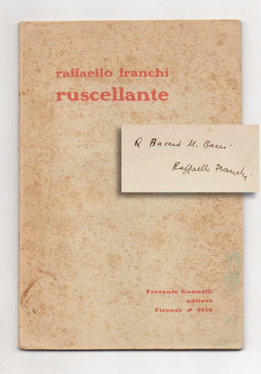 LIBROEdizione originale.CON AUTOGRAFO.Fioriture alla copertina, interno fresco e pulito; nel complesso un ottimo esemplare pregiato da importante invio autografo dell’autore al pittore Bacci: «A Baccio M. Bacci | Raffaello Franchi».Rarissima opera prima. Franchi fu uno dei protagonisti della scena culturale italiana del primo Novecento: fiorentino, sbocciò nel capoluogo toscano appena in seguito a «Lacerba» (sulla «Forca», per la precisione), divenendo rapidamente motore di alcune tra le più innovative esperienze editoriali, dall’«Italia futurista» a «Solaria» passando per «La Raccolta», «L’Enciclopedia» e «Il Baretti». Fu apprezzato scrittore e critico d’arte. -- «La produzione lirica del Franchi, che appartiene tutta alla sua giovinezza, è caratterizzata da poemetti in prosa e da frammenti, intesi, questi ultimi, nel genuino senso della parola e non secondo quel gusto dell’epoca che aveva elevato il frammento lirico a genere letterario. L’influenza dell’opera di Dino Campana appare a quest’altezza quanto mai significativa, e lo stesso Franchi ebbe a dichiarare: “I Canti di Campana stanno agglutinando e fortificando la nostra atmosfera”» (DBI)Cammarota. Futurismo, 214.1